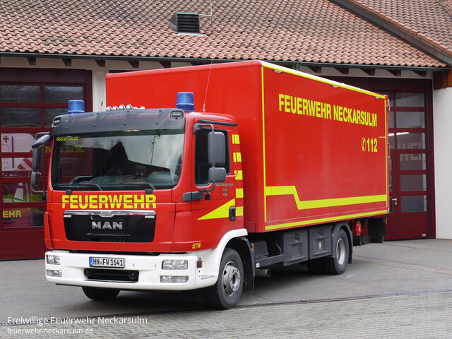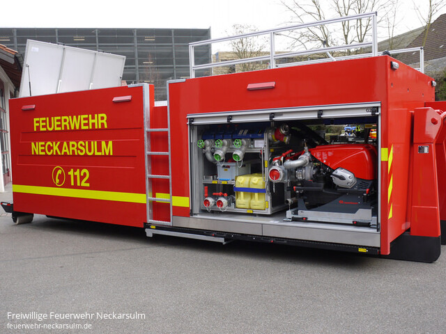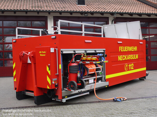 | Die Feuerwehr Neckarsulm konnte zum Jahresende 2014 gleich drei Ersatzbeschaffungen in Empfang nehmen. Ersetzt wurden der marode gewordene Abrollbehälter Wasser, das LF 8 der Abteilung Obereisesheim (Baujahr 1989) und der STW der Abteilung Neckarsulm (Baujahr 1992). Abrollbehälter mit 9000l Wasser und 120l Schaummittel Der Abrollbehälter Wasser wurde zum Zweck der Löschwassersicherstellung und Brandbekämpfung konzipiert. Gebaut wurde er von der Firma GSF Sonderfahrzeugbau in Twist. Neben einem 9000 l fassenden Wassertank aus GFK sind 120l Schaumittel in Kanistern und 100kg Löschpulver in Form zweier P50 Pulverlöscher verlastet. Die Schaumeinspeisung erfolgt über einen Turbozumischer. Zur Brandbekämpfung sind diverses Schlauchmaterial und Strahlrohre sowie eine festverbaute Schnellangriffseinrichtung mit 50 m Schlauch vorhanden. Auf dem Dach des Abrollbehälters kann ein Werfer zur Schaum und Wasserabgabe montiert werden. Als Pumpe kommt eine Tragkraftspritze PFPN 10-15 von Rosenbauer zum Einsatz. Neues LF 10 für die Abteilung Obereisesheim Als Ersatz für das vorhandene LF 8 der Abteilung Obereisesheim wurde ein neues LF 10 der Firma Rosenbauer beschafft. Das Löschgruppenfahrzeug der Rosenbauer CL Baureihe ist auf einem MAN TGL 12.250 2x5 BL Fahrgestell mit 250 PS aufgebaut. Das Fahrgestell verfügt über ein automatisiertes Schaltgetriebe MAN TipMatic mit 12 Gängen. Weitere Details zum Aufbau und zur Beladung: - Pumpenleistung 2000 l/min