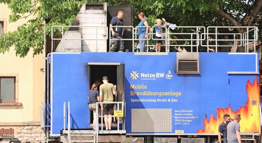 | Die Kirchardter Feuerwehr hat Nachwuchssorgen – es fehlt an Verstärkung bei den Erwachsenen. Dagegen berichtete Kommandant Markus Bucher: „Bei der Kinderfeuerwehr haben wir eine Warteliste, bei den Jugendlichen sind wir auch gut aufgestellt.“ Nun veranstaltete die Rettungsorganisation erstmals seit Jahren wieder einen Tag der offenen Tür. „Da wir aktuell die mobile Brandübungsanlage der EnBW dahaben, bietet sich das an. Wir haben in den vergangenen zwei Wochen unsere Einsatzkräfte da drinnen ausgebildet“, erzählte Bucher. Die Besucher konnten sich beim Rundgang durch die Anlage ein Bild machen, wie die Realität der Feuerwehr in einem Brandobjekt aussieht. Die Wände sind rußschwarz, ein unangenehmer Geruch liegt in der Luft. Für diejenigen, die das nicht mochten, war in der Fahrzeughalle ein Bildschirm aufgehängt, auf den das Geschehen im Container übertragen wurde. Die Feuerwehr hatte an diesem Nachmittag noch mehr zu bieten. „Die Kinder haben in einer kleinen Übung gezeigt, was sie schon gelernt haben“, berichtete Bucher. In der Fahrzeughalle lagen auch Schere und Spreitzer bereit. „Wer möchte, kann die Geräte mal anfassen und wird dabei merken, die haben ein ganz ordentliches Gewicht.“ Zur Freude der jüngsten Besucher waren die Türen des Feuerwehrfahrzeugs geöffnet, so dass sie mal selbst auf dem Fahrersitz oder in der Kabine Platz nehmen konnten. Und dann, gerade als es so richtig heiß auf dem Vorplatz des Feuerwehrhauses wurde, betrat ein Wehrmann in Einsatzkleidung die Szenerie. Zielstrebig steuerte er die Schale mitten auf dem Platz an. 1,5 Liter Öl erhitzte der Retter in den nächsten Minuten – und kippte dann 250 Milliliter Wasser drauf! Es zischte, es knallte und eine schwarze Rauchwolke stieg auf. „Stellen Sie sich vor, das hätten Sie in ihrer Küche unter der Dunstabzugshaube gemacht“, meinte Bucher. „Sie können sich vorstellen, dass von der Dunstabzugshaube nicht mehr viel übriggeblieben wäre, von Ihnen aber möglicherweise auch nicht.“ Die Zuschauer waren beeindruckt. Neben praktischen Einblicken in die Arbeit der Feuerwehr gab es für Interessierte auch jede Menge Informationen. So erkundigte sich ein junger Familienvater, ob er denn als Atemschutzgeräteträger seinen Bart behalten könne. Nein, lautete die Antwort: „Du könntest nur versuchen, nur den vorderen Teil stehenzulassen und den unter der Maske hochzuklappen.“ Eine Idee, von der seine Frau nicht begeistert war: „Da muss er sich zwischen Ehe und Feuerwehr entscheiden.“ Um dem Interessenten einen Eintritt möglicherweise doch schmackhaft zu machen, erfuhr er, dass es bei der Feuerwehr auch andere Aufgaben gibt. An diesem Nachmittag präsentieren sich nicht nur die Einsatzkräfte. Im Obergeschoss lud die Feuerwehrkapelle zur Instrumentenprobe ein. Bild: So sieht sie aus, die mobile Brandübungsanlage. Besucher konnten einen Blick hinein werfen. Drinnen war es rußig, und es roch unangenehm. (Quelle: Franz Theuer, HSt) |
