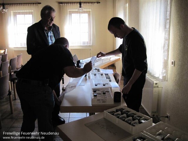 | Nach monatelanger Vorbereitungszeit war es am Samstag, den 22. Mai 2010 endlich soweit. Die Freiwillige Feuerwehr Neudenau stellte auf die lange diskutierte digitale Alarmierung um. Dafür war es notwendig, alle Kameradinnen und Kameraden der drei Abteilungen nach Neudenau ins Feuerwehrhaus einzuladen, um ihnen ihre persönlichen Melder auszugeben. Jeder einzelne Feuerwehrangehörige besitzt nun seinen eigenen Digitalen Meldeempfänger. Jede Abteilung wurde kurz in die neue Technik eingewiesen, danach erfolgten die ersten Probealarme. AnschlieÃend wurde die Feuerwehrleitstelle in Heilbronn darauf hingewiesen, dass die Feuerwehr Neudenau nun digital über das neue POCSAG-Netz alarmiert werden soll. Bei dieser POCSAG-Alarmierung können Kurztexte, ähnlich einer SMS, verschlüsselt an die Meldeempfänger versendet werden - somit kann den Feuerwehrleuten direkt mitgeteilt werden, was für ein Einsatz auf sie wartet… Im gesamtem Stadt- und Landkreis Heilbronn werden in Zukunft alle Feuerwehren, Rettungsdienste, DLRG und THW gemeinsam über einen Funkkanal alarmiert. Dieser wird ausschlieÃlich für die Alarmierung verwendet, somit wird der Sprechfunkkanal deutlich entlastet. Die Stadt Neudenau hat insgesamt rund 140 Meldeempfänger beschafft. Dafür wurden insgesamt etwa 35.000 ⬠ausgegeben. Einen Dank hiermit an die Stadtverwaltung sowie den Gemeinderat für diese Investition in die Zukunft! Einen Dank auch an die Kameraden, die die Organisation der Ausgabe sowie die planerische Umstellung auf Digital-Alarm übernommen haben. |