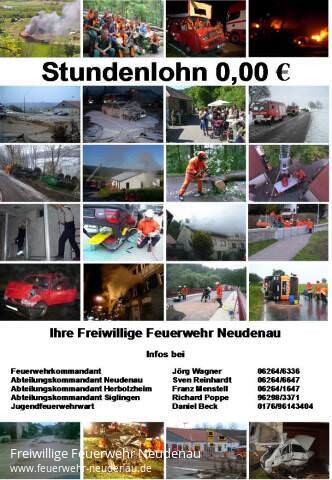 ![]() | Mit einem neuen Plakat will die Freiwillige Feuerwehr Neudenau auf ihre Arbeit zum Nutzen der Allgemeinheit auf sich aufmerksam machen. Es geht dabei natürlich auch, aber nicht nur, um Nachwuchswerbung. Verschiedene Szenarien auf zahlreichen Bildern stellen viele Facetten der Feuerwehrtätigkeiten vor und das unter dem Slogan "Stundenlohn 0,00 Euro". Wir suchen dich! |