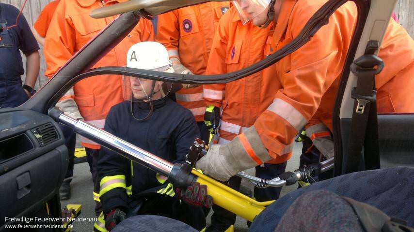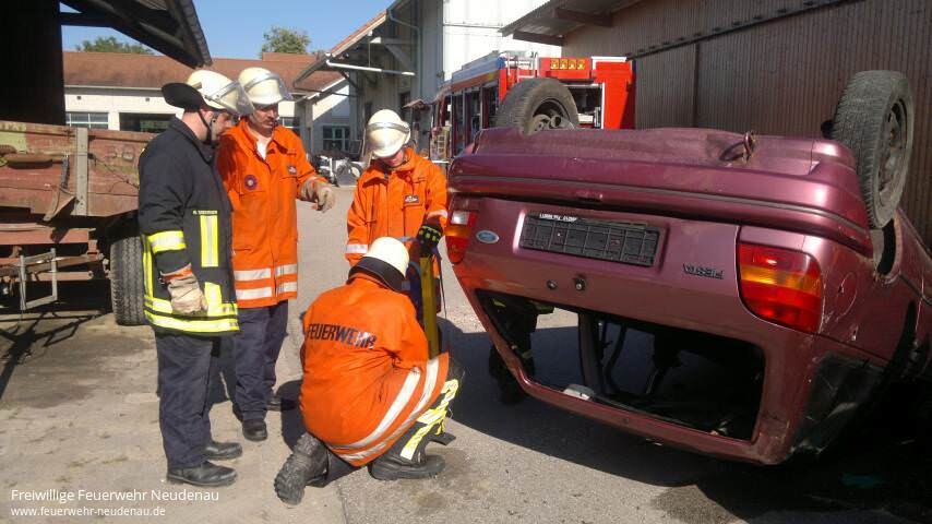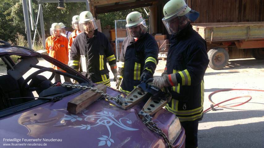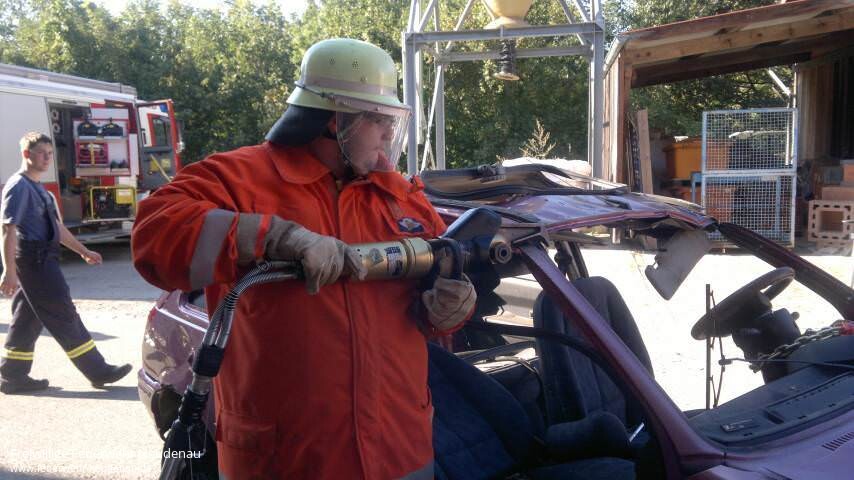 | Bei heißen Temperaturen, um die 30 Grad, trafen sich Kameraden der Einsatzabteilungen Herbolzheim und Neudenau, um wieder einmal eine spezielle Übung zur technischen Hilfeleistung durchzuführen. Zur besseren Übersicht wurde die Mannschaft in drei Gruppen eingeteilt. Nach dem Einrichten von Geräteablagen der jeweiligen Fahrzeuge wurde ein Pkw in verschiedenen Lagen (auf der Seite, auf dem Dach) mit dem Abstützsystem Stab Fast gesichert. Nebenbei wurde die Rettungsplattform aufgebaut. Diese Plattform wird vor allem bei einem Unfall mit beteiligtem Lkw benötigt, um überhaupt in der Höhe eines Lkw-Führerhauses arbeiten zu können. Dann ging es an den Pkw selbst. Wieder einmal wurden alle hydraulischen Rettungsgeräte zum Einsatz gebracht. Der Pkw stand dann am Schluss ohne Türen und ohne Dach da. Die Übung diente hautsächlich dem Handling der Geräte und Werkzeuge. Nach dreistündiger Übung und dem entsprechenden Aufrüsten der Fahrzeuge, war im Florianskeller ein Vesper angerichtet. Bei Dosenwurst und herrlich kühlen Getränken konnte man es ganz gut aushalten. |