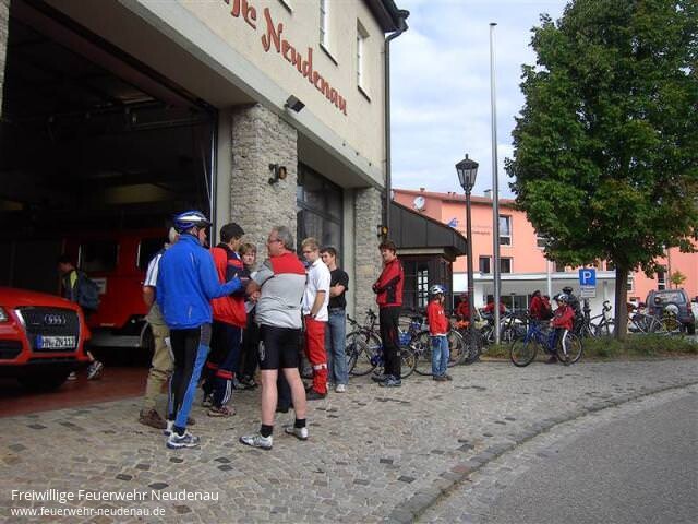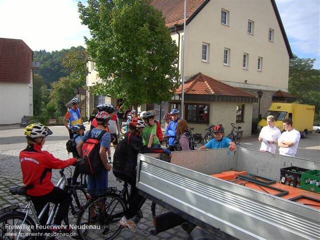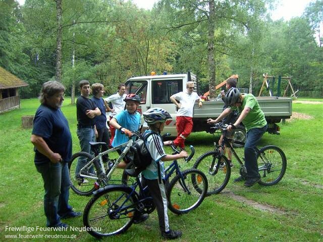 | Schon traditionell ist die Radtour mit dem Bürgermeister beim Neudenauer Kinderferienprogramm. Genauso Tradition ist es, dass eine Delegation der Freiwilligen Feuerwehr diesen Ausflug begleitet. Zusammen mit den Kameraden des DRK-Ortsvereins sorgen die Feuerwehrfrauen und -männer für die Sicherheit der Teilnehmer. 12 Jugendliche hatten sich in diesem Jahr für die Fahrradtour angemeldet. Mit dem ELW fuhr die Feuerwehrdelegation meist voraus, um an gefährlichen Straßenüberquerungen oder Einmündungen die Autofahrer vor den Fahrradfahrern zu warnen oder sogar kurzzeitig einzelne Kreuzungen so zu sperren, damit die Gruppe ungehindert weiterfahren konnte. Auf einem schönen Rastplatz zwischen Volkshausen und Korb war gegen 12.00 Uhr eine Mittagspause angelegt. Die Feuerwehrkameraden und die zwei DRK-Mitglieder sorgten hier für das leibliche Wohl mit Grillwürsten und Getränken. Außerdem konnte den Jugendlichen ein kleines Lagerfeuer geboten werden. Auf der Rückfahrt war nochmal eine kurze Rast beim Eiscafé in Möckmühl, wo Herr Bürgermeister Hebeiß jedem Teilnehmer ein leckeres Eis spendierte. Gegen 15.00 Uhr kamen alle Teilnehmerinnen und Teilnehmer wieder unversehrt und ohne größere technische Probleme in Neudenau an. |