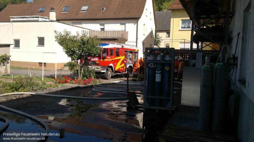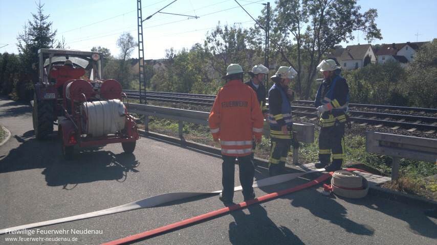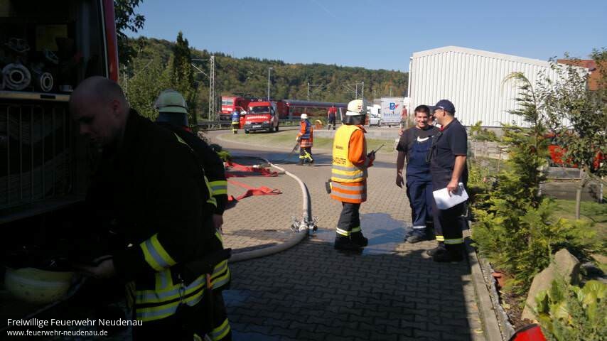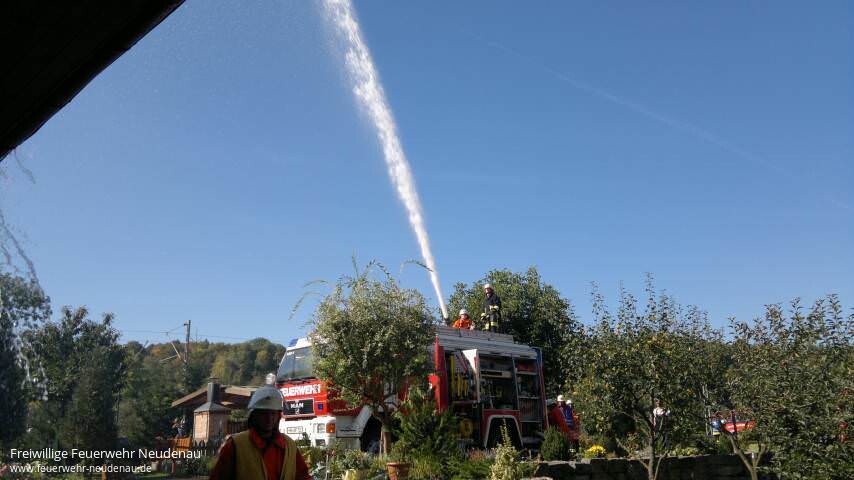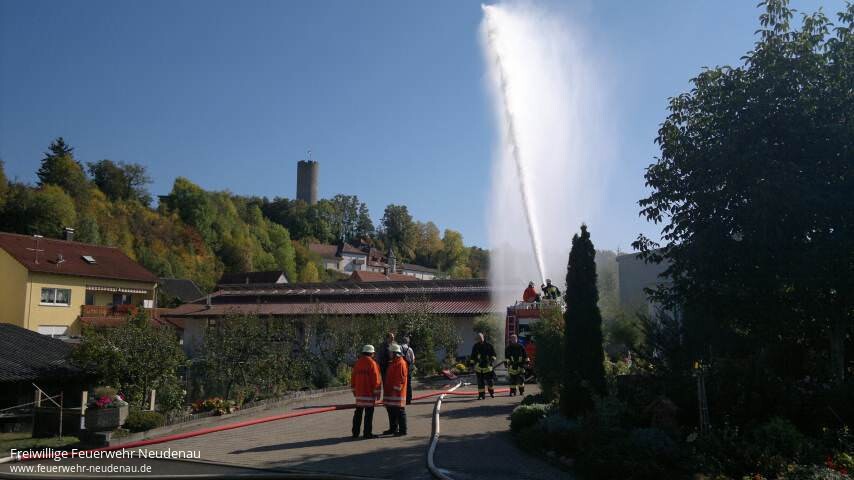 | Seit geraumer Zeit führte die Freiwillige Feuerwehr Neudenau am Samstag, 01.10.2011, wieder einmal eine Hauptübung als Alarmübung durch. Gegen 13.23 Uhr wurde von der Feuerwehrleitstelle Heilbronn Alarm für alle Einheiten der Gesamtwehr ausgelöst. Brand in Firma, Neudenauer Straße in Herbolzheim, war das, was die Leitstelle über Funk durchgab. Die ersteintreffenden Kameraden aus Herbolzheim begangen sofort mit der Menschenrettung. Im Firmengebäude waren zwei Personen vermisst. Unterstützt wurde sie dabei von den Kameraden des kurz darauf eintreffenden Tanklöschfahrzeugs (TLF 16/25) aus Neudenau. Gleichzeitig mit dem TLF war auch der Einsatzleitwagen (ELW1) eingetroffen. Beide Fahrzeuge waren durch geschlossene Bahnschranken in Neudenau aufgehalten worden. Der ELW übernahm vor Ort die Leitung und Koordinierung des Übungseinsatzes, was eine Hilfe und Erleichterung für den Einsatzleiter darstellt. Die weiteren Einheiten waren, das Staffellöschfahrzeug (StLF 10/6) aus Siglingen, das ebenfalls in die Brandbekämpfung eingebunden wurde, das Tragkraftspritzenfahrzeug (TSF) aus Reichertshausen und der Gerätewagen (GW) aus Neudenau. TSF und GW wurden zur nahegelegenen Jagst beordert um die Wasserversorgung sicherzustellen. Zusammen mit den Kameraden aus Kreßbach wurden drei B-Leitungen zur Wasserversorgung an die Brandstelle gelegt. Pro Leitung werden ca. 800 Liter Wasser pro Minute gefördert. Erst jetzt konnte der Wasserwerfer auf dem Dach des TLF in Betrieb genommen werden. Dieser Wasserwerfer muss von zwei B-Leitungen versorgt werden. Der Übungseinsatz wurde mit Bravour vom stellvertretenden Abteilungskommandant Andreas Beck (Herbolzheim) geleitet. Nach erfolgter Manöverkritik gab es noch eine Stärkung bei heißen Würsten und kühlen Getränken. Unwissend, dass einige Stunden später die gleiche Mannschaft einen Dachstockbrand in der Neudenauer Altstadt bekämpfen muss. |
