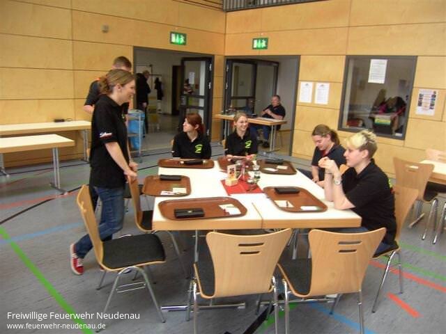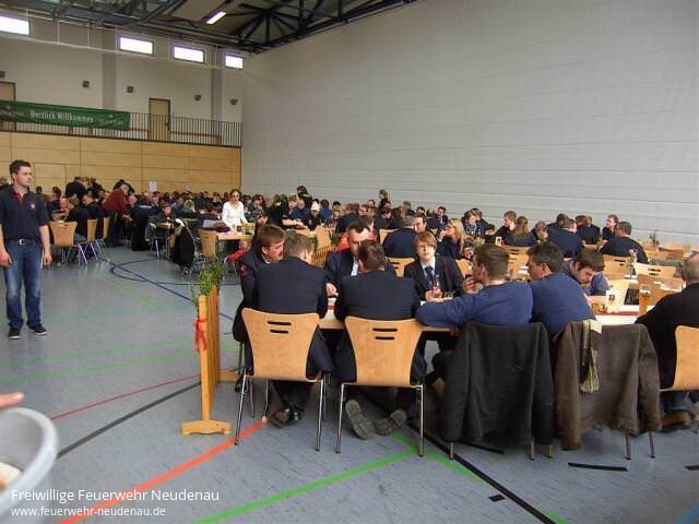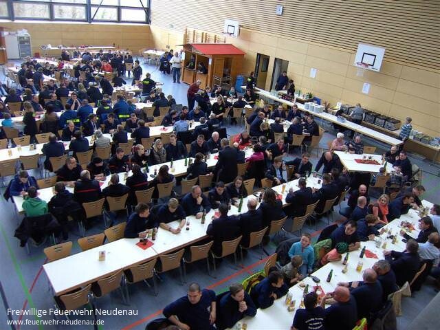 | Auch in diesem Jahr kann dem Neudenauer "Tag der Feuerwehr" wieder der Stempel "Erfolgreich beendet" aufgedrückt werden. Bei nicht ganz so gutem Wetter wie in den Vorjahren mussten dennoch in der Spitzenzeit um die 250 Personen gleichzeitig bedient werden. Erfreulicherweise konnten bereits ab 10 Uhr in der Früh Kameradinnen und Kameraden der benachbarten Wehren in der Neudenauer Sturmfederhalle zum Frühschoppen begrüßt werden. Ab 11.30 Uhr gab es den begehrten Floriansbraten mit Knödeln, der auch viele Bürger der Stadt Neudenau in die Halle lockte. Das Programm drumherum war ebenso vielfältig wie das Angebot an Speisen und Getränken. Die Jugendfeuerwehr bot für die Kinder einen Erlebnisparcours an, die Kindergruppe der Jugendfeuerwehr einen Bastel- und Maltisch mit vielen Bildern und Informationen aus der neu gegründeten Mannschaft. Ebenso gab es einen Infostand der Helfer-vor-Ort Neudenau. So konnte am Abend des 24. März ein positives Resümee gezogen werden, alle Beteiligten zeigten sich rundum zufrieden mit dem Tag der Feuerwehr 2013. |