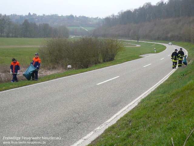 | Auch in diesem Jahr fand wieder einmal eine Waldreinigung der Jugendfeuerwehr Neudenau mit den örtlichen Jägern, unter der Leitung von Ernst Vogt und Jürgen Pischinger, statt.Zum ersten Mal war auch die Gruppe der neu gegründeten Kinderfeuerwehr dabei und unterstützte tatkräftig.Treffpunkt war um neun Uhr am Bauhof in Neudenau.Nachdem alle Gruppen eingeteilt waren ging es auch schon los.Die Kinderfeuerwehr startete im Bereich des Freibadparkplatzes und säuberte den Weg bis zur Gangolfskapelle.Der Einsatzbereich der Jugendfeuerwehr war die L 526 und die L 1096 Richtung Untergriesheim. Es wurde wieder einiges an Müll gefunden, eingesammelt und entsorgt.Man glaubt gar nicht was man da so alles finden kann.Die zentrale Abladestelle waren bereitgestellte Container im Bauhof.Nach etwa drei Stunden Arbeit und vollen Containern fuhr die Gruppe zum Abschluss an die Saatschule.Dort hatten die Jäger bereits Feuer gemacht und für Essen und Getränke war auch gesorgt.Nach einem entspannten Mittagessen war auch diese Aktion geschafft und die Wälder und Straßen um Neudenau sind wieder sauber. |