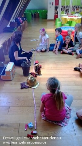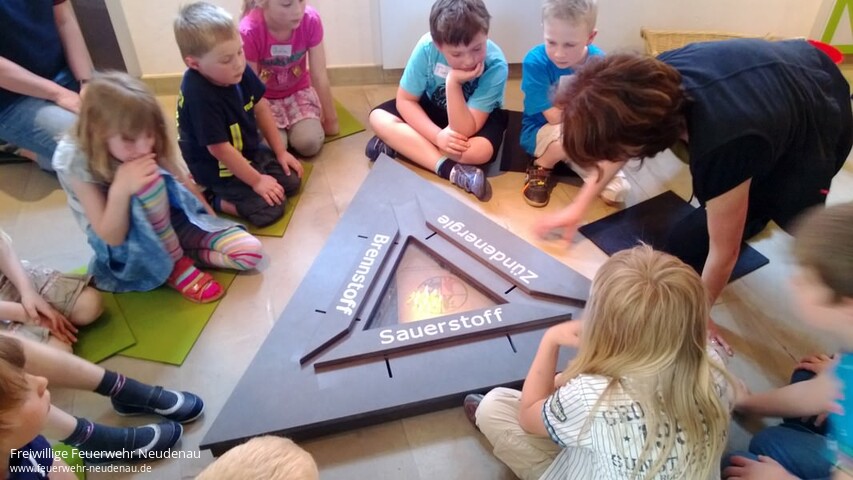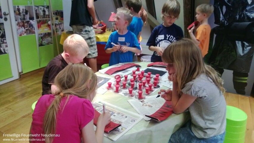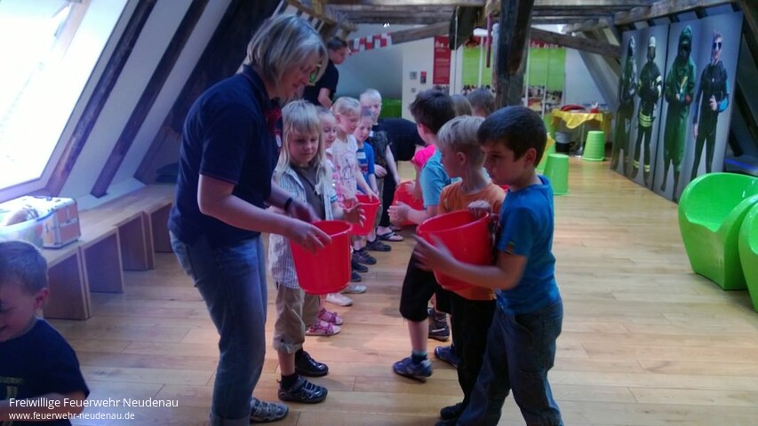 | Beim Abschied gab es kurz sogar Tränen! Felix wollte nicht ins Museum. Er dachte, da stehen nur alte Feuerwehrautos. Zum Schluss war auch Felix hellauf begeistert von der Ausstellung "s`brennt" und der Führung und Anleitung von Frau Schick, im Neckarsulmer Stadtmuseum.Zwölf Kindern der Neudenauer Kinderfeuerwehr waren bei dem kleinen Ausflug dabei.Im Stadtmuseum angekommen erklärte Frau Schick zuerst die zeitlichen Abläufe im Umgang mit dem Feuer. Dafür bediente sie sich eines Seiles, gewissermaßen als Zeitstrang. Am Anfang konnten die Menschen kein Feuer machen. Sie waren auf Blitzschläge und Vulkane angewiesen. Den Umgang mit Feuer mussten sie auch erlernen. Nach und nach stellten sie fest, dass Feuer wärmt, dass es zum Kochen und Braten genutzt werden kann und dass es die wilden Tiere fern hält.Dann kamen die ersten Utensilien um selbst Feuer zu machen. Feuersteine oder aber auch die Holzstäbchen solange drehen, bis aus der Reibung Wärme und schließlich Feuer wird.Weiter im Zeitstrang bauten die Menschen dann Häuser und Städte. Nun wurde der Brandschutz wichtiger. Die ersten Alarmsignale und auch organisatorische Abläufe bei Bränden wurden festgeschrieben. Es gab die ersten Ausrüstungsgegenstände, die heute noch vorhanden sind, so zum Beispiel den Helm.Angekommen in der Gegenwart ist Feuer machen kein Problem mehr. Heute haben wir dafür Feuerzeug und Streichhölzer.Mit Eimern wurden dann Spielbälle aus einem Planschbecken geschöpft, mehrere Meter mit einer Eimerkette transportiert und dann schließlich ins imaginäre Feuer gegossen. Das mit der Eimerkette erwies sich als sehr anstrengend.Logisches Mitdenken erforderte im Anschluss die Arbeit am Verbrennungsdreieck. Drei Voraussetzungen braucht ein Feuer, Zündenergie, brennbarer Stoff und Sauerstoff. Entzieht man dem Feuer nur eines, kann es nicht mehr weiter brennen.Das Absetzen eines Notrufes am Telefon, Umziehen in Rekordgeschwindigkeit und eine praktische Löschübung gehörte dann noch zur Führung.Nach einer kurzen, selbst mitgebrachten, Stärkung ging es dann an das Bedrucken von Schläuchen. Jedes Kind konnte seinen Namen auf ein Stück Feuerwehrschlauch drucken und dieses Stück dann als Erinnerung mit nachhause nehmen.Mit viel neuem Wissen und dem Schlauchsouvenir fuhren die Kinder Richtung Neudenau. Die Begeisterung über das Erlebte war ihnen anzumerken. |
