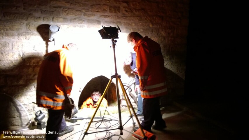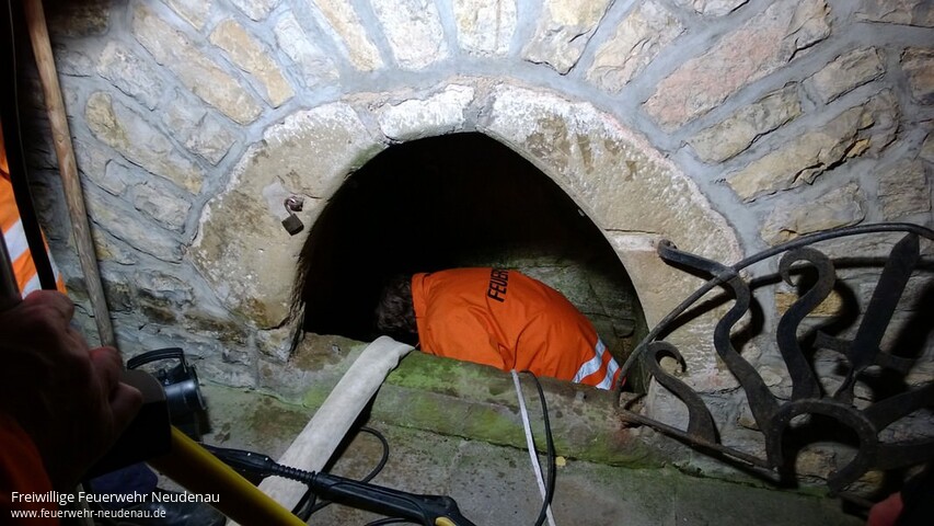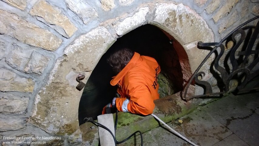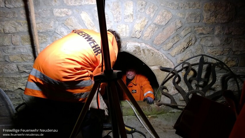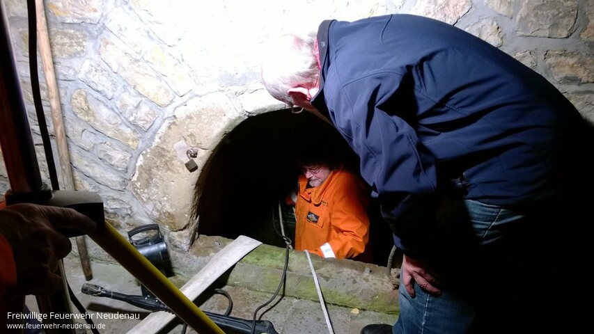 | Zu einem außergewöhnlichen Übungsdienst rückten die Kameraden der Neudenauer Altersabteilung aus. Mitglied Eckehard Meckes, der auch Vorsitzender des Fördervereins St. Gangolf ist, hatte die Zustände an der Gangolfsquelle bemängelt. Der Brunnenschacht sei schmutzig und Rohrleitungen fast verstopft. Die Feuerwehrsenioren rückten mit dem Gerätewagen (GW) an. Mittels einer elektrischen Tauchpumpe wurde der Brunnen schnell geleert und anschließend mit einem Hochdruckreiniger gesäubert. Außerdem wurden einige Wurzeln entfernt, die sich Richtung Wasser vorgearbeitet hatten. Jetzt kann das Quellwasser wieder ungehindert fließen. Der nächste Gangolfsritt kommt bestimmt! www.gangolfsritt.de |