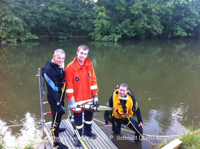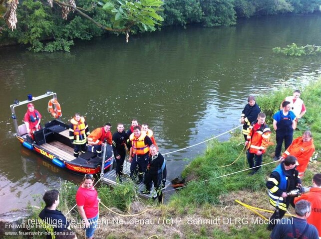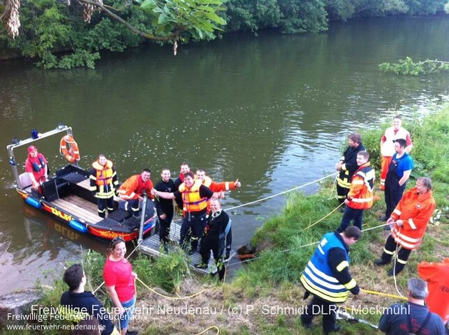 | Unter der Leitung von Matthias Bauer fand am 05. Juni eine gemeinsame Übung der Freiwilligen Feuerwehr Neudenau und der DLRG Ortsgruppe Möckmühl an der Schneidmühle in Neudenau statt. Matthias Kurz, in der DLRG Einsatztaucher und Tauchlehrer, ist in Neudenau stellv. Abteilungskommandant der Freiwiligen Feuerwehr Neudenau. Die Zusammenarbeit aller Kräfte stand deshalb auch bei dieser Übung im Vordergrund. Nebeneinander und miteinander. Übungsszenario war, dass ein mit Personen besetzter Bus von der Straße abgekommen und in die Jagst gestürzt ist. Der Fahrgastraum ist über Wasser, die Personen aber eingeklemmt. Der Bus ist genau so weit vom Ufer entfernt, dass mit einem Boot nicht beizukommen ist. Also musste ein Steg bzw. eine Konstruktion gebaut werden, welche tragfähig ist um mit hydraulischem Gerät arbeiten zu können. Eine Herausforderung für alle. Gemeinsam wurde mit dem Material der Feuerwehr an Land eine Konstruktion gebaut, die dann im Wasser durch die DLRG Taucher stabilisiert und befestigt wurde. Letztlich wurde die Aufgabe von allen gemeistert, die Konstruktion war tragfähig und konnte sogar noch als Landungssteg fungieren. Wegen auslaufendem Treibstoff wurde flussabwärts eine Ölsperre errichtet. Hier unterstütze Patrick Ziegler die Feuerwehrkameraden mit dem Rettungsboot Mechita IV. Insgesamt war es eine erfolgreiche Übung, die hervorragend von allen gemeistert wurde. Und zur Kameradschaftspflege gehört nicht nur das gemeinsame Aufräumen, sondern auch vor allem das Zusammensitzen im Anschluss der Übung. So wurden wir von den Feuerwehrkameraden zu einem leckeren Essen in den „Feuerwehrkeller“ eingeladen. Und auch hier hat die Zusammenarbeit bei Essen und Trinken bestens funktioniert! |