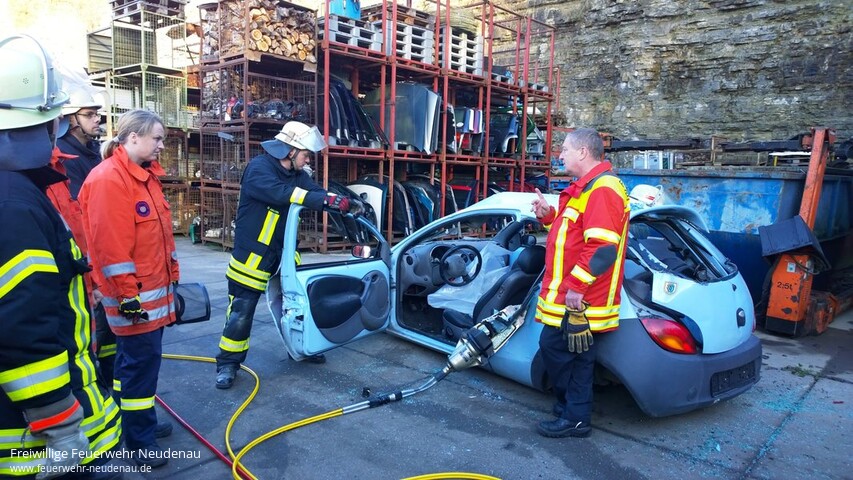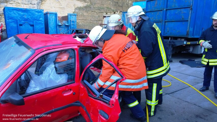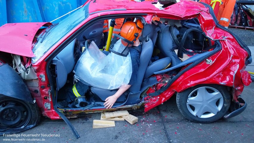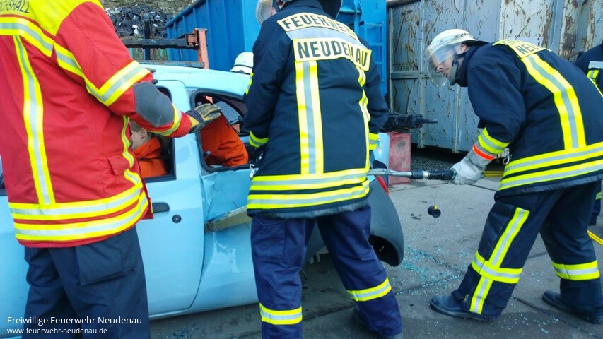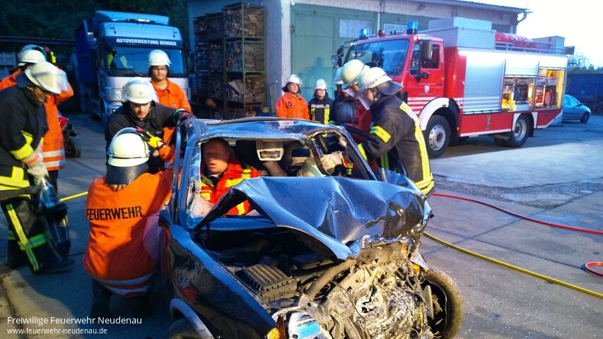 | Schon fast ein bisschen Tradition hat es bei der Einsatzabteilung Neudenau, dass das Übungsjahr mit einem Übungsblock um Thema technische Hilfeleistung/patientengerechte Rettung abgeschlossen wird. So konnten wir mit Christoph Frühauf von der Feuerwehr Bad Friedrichshall einen hervorragenden Ausbilder gewinnen. Aufgrund unserer Situation, dass im Moment kein Gerätewagen zur Verfügung steht, standen für die Übung verschieden Gerätschaften nicht zur Verfügung. Auf Anfrage brachte Christoph Frühauf den Rüstwagen der Feuerwehr Bad Friedrichshall zur Übung mit. An insgesamt drei Pkw wurde geübt. Die Fahrzeuge waren zuvor mehr oder weniger stark deformiert worden, um Unfallschäden nachzustellen. |