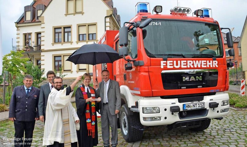 | Ein wertvolles Präsent bekam die Neudenauer Freiwillige Feuerwehr zum 150-jährigen Bestehen überreicht. Es kostete immerhin 2,4 Millionen Euro. Die Geschenkpackung enthielt die Erweiterung des Feuerwehrgerätehauses für 1,8 Millionen Euro, das für 400 000 Euro sanierte bestehende Gebäude und für 201 000 Euro einen neuen Gerätewagens Logistik 2 (GLW 2) dazu. Zur Einweihungs- und Übergabefeier der neuen Einrichtungen konnte Neudenaus Bürgermeister Manfred Hebeiß auch Gäste aus der Landespolitik begrüßen. In der Welt der Blauröcke fühlt sich Innenminister Reinhold Gall (SPD) besonders wohl, schließlich ist er auch Vorsitzender des Kreisfeuerwehrverbandes Heilbronn. Und Gall sah die Zuschussgelder des Landes in der Jagsttalkommune hervorragend angelegt. „Ich gratuliere daher nicht nur meinen Kameraden der Feuerwehr sondern auch der ganzen Bürgerschaft für diese neuen Einrichtungen und Beschaffungen“, sagte der Innenminister im Gerätehaus. Beeindruckt In der Stadt Neudenau würde beeindruckend demonstriert wie Ehrenamt funktioniert: „Beeindruckt haben mich nicht nur was hier geschaffen wurde, sondern auch der hohe Ausbildungsstand der Feuerwehr und die hervorragende Jugendarbeit“, lobte der Innenminister aus Stuttgart. Immerhin feiert die Jugendfeuerwehr auch ihr 25-jähriges Bestehen. Auf Schadenslagen könne jetzt in Neudenau hervorragend reagiert werden, fügte er an. Ihm schloss sich auch sein Landtagskollege Dr. Bernhard Lasotta (CDU) an der erwähnte: „Die Bürgerschaft kann stolz sein, vom Feuerwehrstandort mitten im Ort aus, die Daseinsfürsorge der Kommune zu sichern“, sagte er. Beide Landespolitiker dankten dem Gemeinderat und dem Bürgermeister, die Feuerwehr mit guten Gerätschaften und Immobilien auszustatten, die auch die Moral und Kameradschaft der Feuerwehr stärke. Der stellvertretende Kreisbrandmeister Uwe Thoma gratulierte und überbrachte die Glückwünsche des Landkreises Heilbronn und erwähnte, dass es in Neudenau gelungen sei, das Feuerwehrkonzept konsequent umzusetzen. Riskieren 365 Tage im Jahr und rund um die Uhr einsatzbereit sein und dabei Leib und Leben riskieren, um in Not geratenen Menschen zu helfen oder deren Hab und Gut zu retten: „Dafür sage ich Ihnen meinen allerherzlichsten Dank, auch im Namen der ganzen Bevölkerung“, sagte Bürgermeister Manfred Hebeiß . Als „i-Tüpfelchen“ bezeichnete Hebeiß daher die neue Einsatzkleidung, mit der die komplette Wehr ausgestattet wurde. Steinbruch Der Planer und Bauleiter des Projektes, Gerd Schäfer ging nochmals auf die Herausforderungen der Lage des Objektes und den Baugrund ein, ein ehemaliger aufgefüllter Steinbruch, der in der Startphase gleich für Mehrkosten sorgte. „Wir haben aber mit 180 Quadratmeter die größten Bohlenbalkendecke Süddeutschlands eingebaut“, sagte er. Pater Adam und Pfarrerin Susanne Spöhrer sprachen Gebete und Fürbitten für das Feuerwehrhaus, die Pater Adam mit der Gitarre begleitete. Im Regen wurde dann der GWL2 gesegnet und an Kommandant Jörg Wagner und damit seiner Bestimmung übergeben. Bild: Pater Adam und Pfarrerin Susanne Spöhrer segnen mit (v.r.) Reinhold Gall, Manfred Hebeiß und Jörg Wagner den GLW 2. (Foto: Rudolf Landauer) |