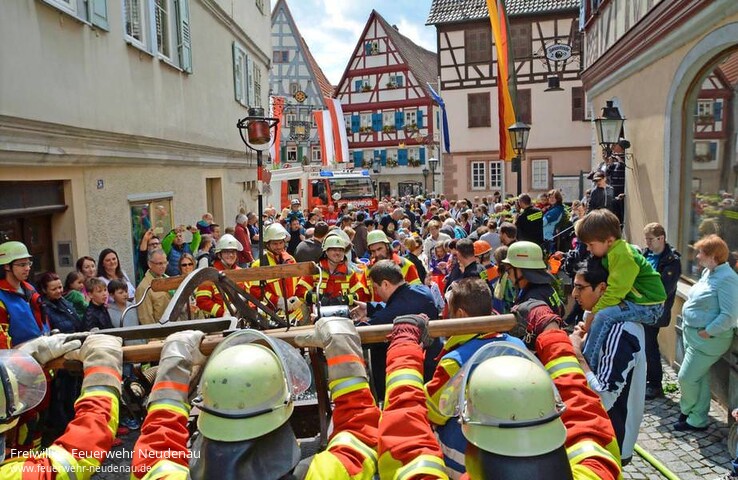 | Ihr 150-jähriges Bestehen feierte die Freiwillige Feuerwehr Neudenau am Wochenende. An drei Tagen stand die Jagsttalstadt im Zeichen der Blauröcke, die sich auf dieses Fest gut vorbereitet hatten. Nachdem am Freitag das sanierte und erweiterte Gerätehaus eingeweiht und das neue Feuerwehrfahrzeug in Dienst gestellt worden war, zeigte die Wehr am Samstag in der Altstadt bei zwei Schauübungen, wie einst und heute Brände gelöscht wurden und werden. Genau um 15 Uhr ertönte am Samstag die Alarmsirene. Nach kurzer Zeit fuhren Einsatzfahrzeuge auf den Markplatz, wo sich zahlreiche Schaulustige eingefunden hatten. Sie wollten erfahren, wie man vor über 100 Jahren und heute Gefahrensituationen begegnete. Die Übungslage gab vor, dass aus dem historischen Rathaus Rauch nach außen drang und offenbar Menschen darin eingeschlossen waren. Aus seinem Büro im zweiten Obergeschoss wurde Bürgermeister Manfred Hebeiß aus luftiger Höhe gerettet, indem er, durch ein Seil gesichert, aus seinem Fenster auf eine lange Alu-Ausziehleiter stieg und herunter kletterte. Hebeiß bekam viel respektvollen Applaus dafür. Ob er Angst gehabt habe? „Seit ich daheim meine Scheune umgedeckt habe, bin ich absolut schwindelfrei“, antwortete der Schultes. Eimerkette Die Abteilungen Herbolzheim und Siglingen unterstützten die Neudenauer bei der Übung. Dann verkündete Feuerwehrmann Matthias Bauer auf der Rathaustreppe, dass die Menschen eine Eimerkette bilden sollten, mit der die historische Pumpe von 1905 mit Wasser aus dem Michaelsbrunnen versorgt werden sollte. Was früher bitterer Ernst war, geriet jetzt zum Spaß. Nach einiger Zeit kam tatsächlich per Muskelkraft ein kräftiger Wasserstrahl aus dem Strahlrohr, und die schwitzende Pumpenmannschaft durfte den Beifall der Zuschauer entgegennehmen. Vom Feuerwehrgerätehaus bis hinauf zum Schloss standen am Sonntag fast 30 historische Feuerwehrfahrzeuge aufgereiht und fanden viele Betrachter. Neudenaus Feuerwehrkommandant Jörg Wagner und Abteilungskommandant Sven Reinhardt: „Das ist sehr schön von unseren Kameraden aus der ganzen Region, dass sie unser Jubiläum mit ihren tollen Fahrzeugen besuchen“, sagte das Führungs-Duo. Mit mehreren Fahrzeugen kam der Verein Historische Feuerwehrfahrzeuge Neuenstadt nach Neudenau, aus Bad Friedrichshall, Schwäbisch-Hall, Bruchsal, Gaildorf kam weiteres Gerät. Da bekam auch Ehrenkommandant Trudbert Keim glänzende Augen: „Viele dieser Fahrzeuge sind mir gut vertraut“, sagte er. Krämermarkt Ein Krämermarkt und Unterhaltung durch den Musikverein beim Frühschoppen rundeten das Fest ab. Aus Herbolzheim im Breisgau reiste eine Feuerwehr-Delegation an, die mit dem Neudenauer Ortsteil Herbolzheim eng verbunden ist. Die Ehefrau des dortigen Feuerwehrkommandanten Martin Hämmerle, Conny Hämmerle, meinte: „Wir sind sehr gerne hierher gefahren. Uns gefällt es prima im Jagsttal, und wir haben Freunde hier.“ Das Josefine-Weihrauch-Museum präsentiert bis zu den Sommerferien sonntags die Sonderausstellung Feuerwehr. Bild: Mit der Pumpe von 1905 wurde in der engen Altstadt Neudenaus demonstriert, wie anno dazumal Brände gelöscht wurden. (Foto: Rudolf Landauer) |
