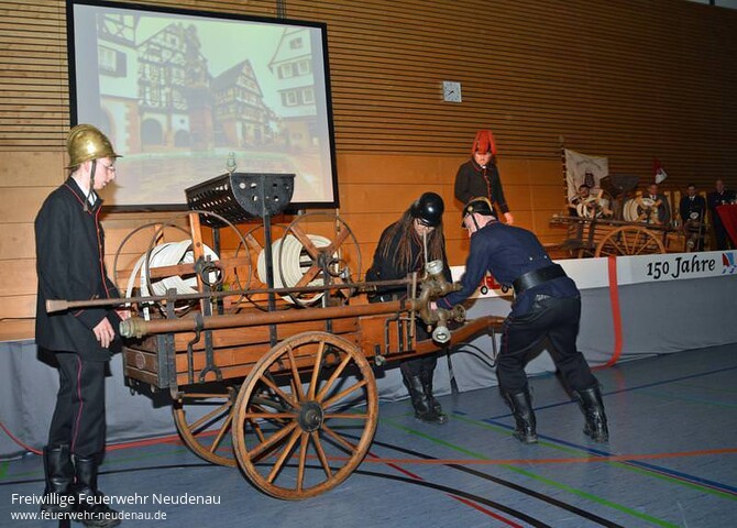 | Erst im zweiten Anlauf klappte die Gründung einer Feuerwehr in Neudenau vor 150 Jahren, nachdem drei Jahre zuvor Bürgermeister Geißler mit seinem Antrag scheiterte. Geldgründe seien es damals gewesen, wird gemunkelt. Am 19. November 1865 fanden sich aber im Gasthaus „Zum Lamm“ in Neudenau wackere Bürger der Stadt ein, um ein freiwilliges Löschwesen in der Stadt einzurichten. Einige Wochen zuvor hatten sie vom großherzoglichen Bezirksamt Mosbach die Genehmigung bekommen. Kaufmann Franz Merckle wurde erster Hauptmann der Stadt. 150 Jahre später, stellte die Theatergruppe der heutigen Wehr die Versammlung damals im Lamm authentisch nach. Auf den Tag genau nach 150 Jahren luden die Stadt und die Freiwillige Feuerwehr am Donnerstag Gäste in die Sturmfederhalle ein, um mit ihnen dieses stolze Datum zu feiern. Fachwerk Eine stattliche Zahl von Ehrengästen nahm an dem Jubiläumsfestakt teil, der nicht das typische Programm eines Jubiläumsfestes hatte. Es gab keine langen Ansprachen wo der sechste Redner seine Vorredner wiederholt. Bürgermeister Manfred Hebeiß war es dennoch wichtig zu betonen, wie wichtig die Feuerwehr in seiner Stadt sei, mit einer Gefährdungslage durch enge Bebauung und viele Fachwerkhäusern. „Wir haben im Jubiläumsjahr rund drei Millionen Euro in die Feuerwehr investiert“, sagte er. In lockerer Runde stellte Moderator Mathias Bauer den Ehrengästen Fragen. Gut war der Festabend vorbereitet und die Theatergruppe Neudenau hat ihm mit szenischen Beiträgen eine unterhaltsame Note gegeben. Stationen aus den Jahren 1798, 1865, 1880 und 1944 wurden authentisch dargestellt. Die Gegenwart präsentierte die Schar der Feuerwehrjugend, die ihr 25-jähriges Bestehen feierte und turbulent viele Luftballons zum Platzen brachte. Die Szene im 18. Jahrhundert, als nach einem Großbrand ein kleines Mädchen auf die Bühne kam und zwei Frauen den Brand diskutierten, ging den Gästen unter die Haut: „Sie sind nicht mehr da, meine Mutter und mein Vater fehlen, sie sind weg“, schluchzte das Kind. „Herr Gall, was fühlen sie als Innenminister, Familienvater und Feuerwehrmann bei dieser Szene“, fragte Mathias Bauer den Gast. „Mir geht so etwas nahe, ich habe in meiner Tätigkeit einige solcher Vorfälle erlebt und dabei wird stets deutlich, wie wichtig es ist, dass es Menschen gibt, die sich in den Dienst anderer Menschen begeben und aktiv helfen, so wie hier in Neudenau“, sagte Gall. Moderne Technik Auch der CDU Landtagsabgeordnete Dr. Bernhard Lasotta stellte den Menschen in den Mittelpunkt. „Die moderne Technik und die Geräte müssen von Menschen bedient werden, alleine funktionieren diese Dinge nicht, stets steht ein Mensch dahinter“, sagte er. Fragen beantworteten auch der erste Landesbeamte im Landratsamt, Lutz Mai, Kreisbrandmeister Uwe Vogel, Bezirksbrandmeister Frieder Lieb, Kommandant Jörg Wagner und Jugendleiter André Sandrisser, die alle zum Jubiläum gratulierten. Bild: Wie einst eine Feuerwehrübung ablief zeigten Mitglieder der Feuerwehr beim Festakt zum 150-jährigen Jubiläum. Nicht alles klappte damals auf Anhieb. (Foto: Landauer) weitere Bilder auf www.feuerwehr-neudenau.de |