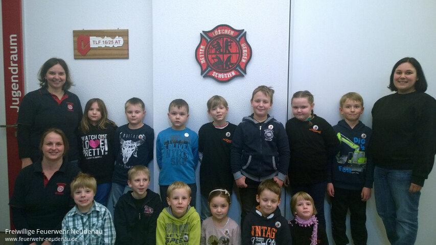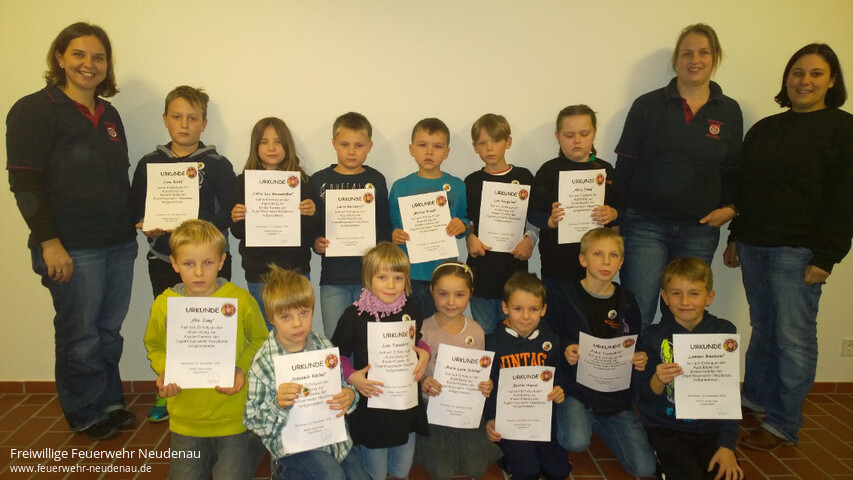 | Über das komplette Jahr 2016 wurde bei der Kindergruppe der Jugendfeuerwehr Neudenau fleißig geübt und Neues gelernt. Grund dafür war die neu zusammen gestellte „Kinderflamme“, einen kleinen Wettbewerb in Anlehnung an die Jugendflamme der Großen in der Jugendfeuerwehr. Unterteilt in drei „Kinderflämmchen“ wurden die Bereiche Brandschutzerziehung, Erste Hilfe und Löschmittel besprochen und in vielen praktischen Übungen erklärt. Am Ende eines jeden Bereiches gab es eine kleine „Prüfung“ die natürlich in der Gruppe bearbeitet und gelöst wurde. Bei der Abteilungsversammlung war es dann endlich soweit. Alle Kinder hatten die Kinderflamme mit Bravour bestanden und konnten stolz ihre Urkunden und Anstecker, aus den Händen des Kommandanten, Jörg Wagner, und des Jugendfeuerwehrwarts, André Sandrisser, entgegennehmen. |