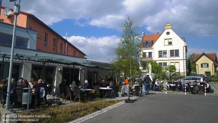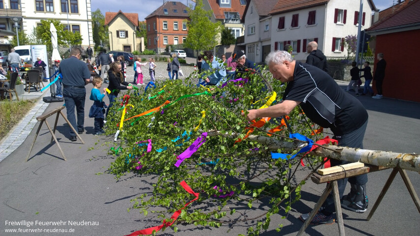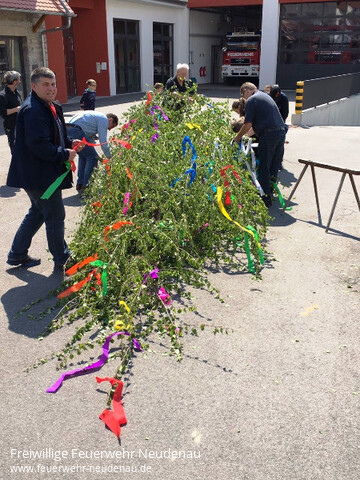 | Auf ein durchaus ereignisreiches Wochenende blickt die Feuerwehr Neudenau zurück. Am Samstag, 29.04.2017, feierte das Haus am Lindenplatz sein Maibaumfest bei windigem, aber schönem Wetter mit Sonnenschein. Schon in Tradition schmücken und stellen die Angehörigen der Altersabteilung den Maibaum in Nachbarschaft des Feuerwehrhauses. Leider nicht so toll war das Wetter am Maifeiertag, an dem der Radler- und Wanderertreff der Jugendfeuerwehr stattfand. Trotzdem herzlichen Dank allen Gästen, die dennoch den Weg zum Fest fanden und auch Dank allen Helfern. |
