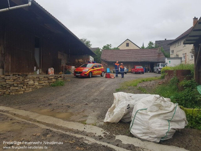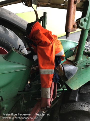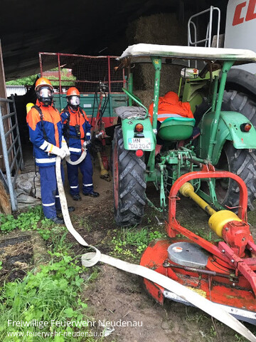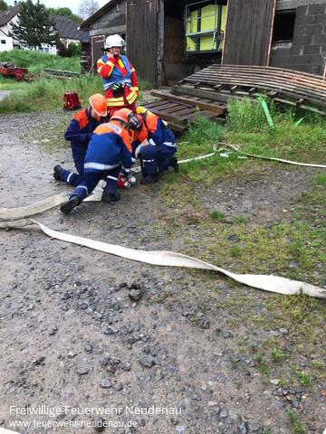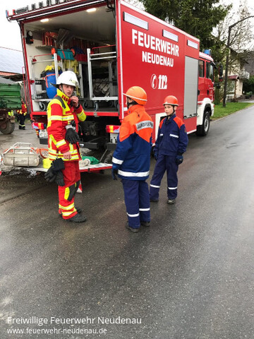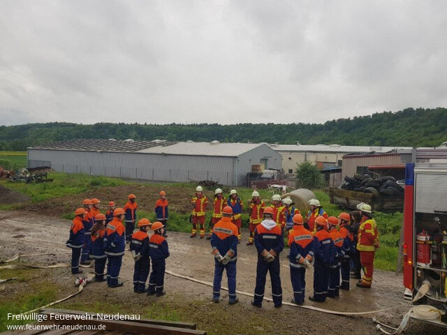 | Eine große Übung stand auf dem Plan der Jugendfeuerwehr Neudenau. Das Szenario war ein Brand auf einem landwirtschaftlichem Anwesen mit vermisster Person. Die Jugendfeuerwehr rückte mit dem Tanklöschfahrzeug (TLF), Gerätewagen-Logistik (GW-L2) und Einsatzleitwagen (ELW1) aus. Am Einsatzort eingetroffen wurde ein Löschangriff aufgebaut und einige rüsteten sich mit „speziellen“ Atemschutzgeräten der Jugendfeuerwehr aus. Ein Trupp rückte unter „Atemschutz“ zum Brand vor, um diesen zu bekämpfen. Dabei entdeckte der Trupp die vermisste Person und machten eine sogenannte Crashrettung, Hierbei wurde die Person unter den Armen geschnappt und so schnell wie möglich vom Brandherd entfernt, Im Anschluss an die Rettung übernahmen die HvO Neudenau die Patientenversorgung bis zur fiktiven Übergabe an den Rettungsdienst. Ein zweiter Trupp machte sich dann an die Brandbekämpfung, um das Feuer zu löschen. Nach erfolgreichem Löschen gab es noch eine Besprechungsrunde und nach dem Abmarsch wurden die Fahrzeuge noch gereingt. |