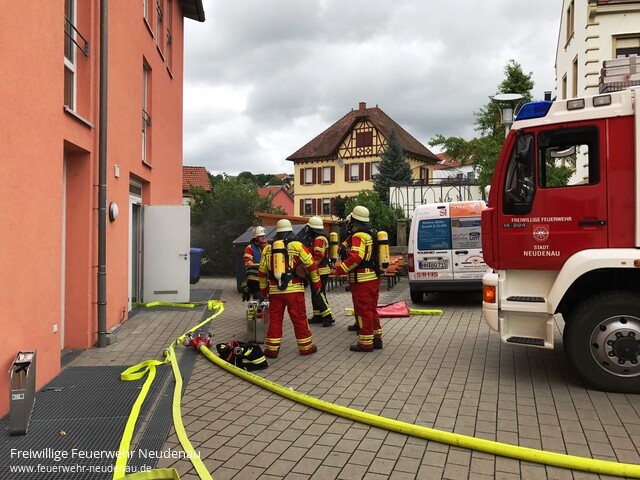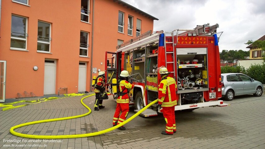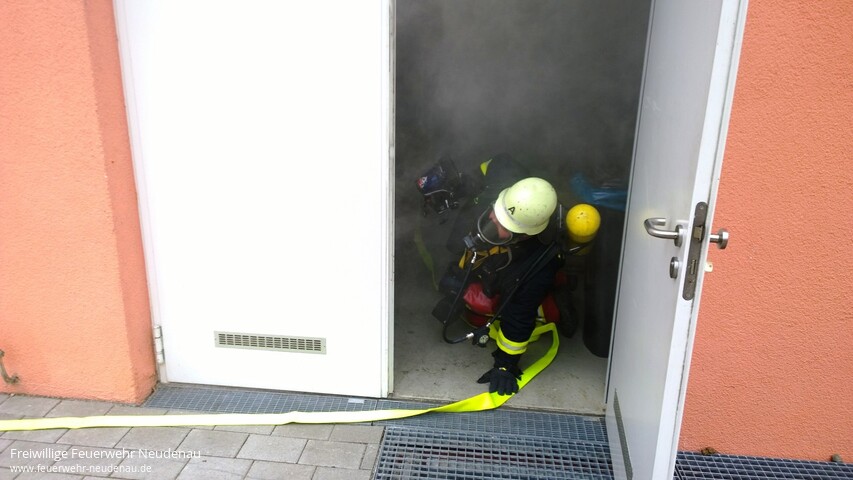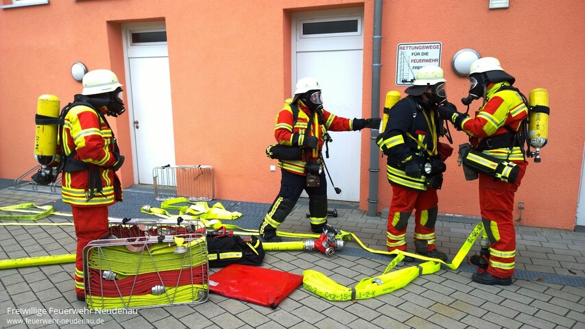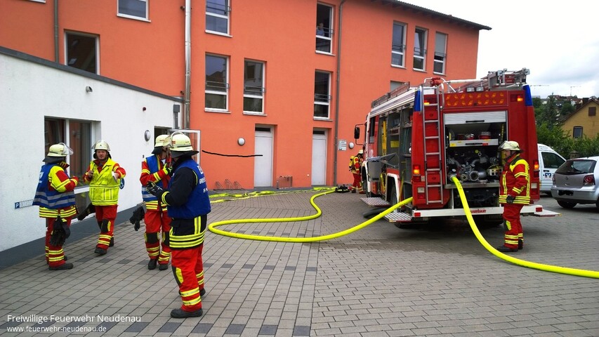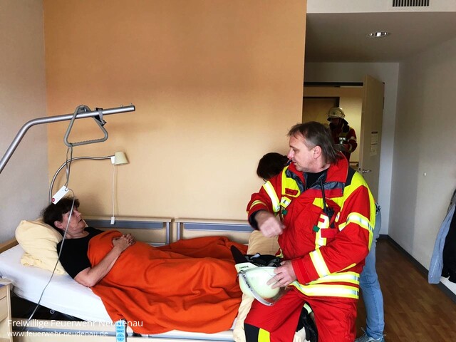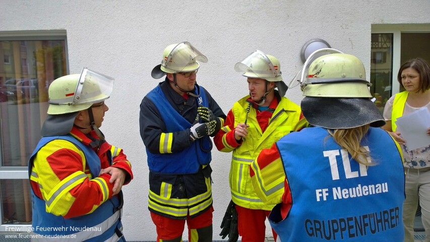 | Eine unangekündigte Alarmübung fand bei der Feuerwehr Neudenau statt. Um 14.39 Uhr wurden alle drei Einsatzabteilungen zum Seniorenheim Haus am Lindenplatz alarmiert. Die Brandmeldeanlage hatte ausgelöst. Beim Eintreffen von Einsatzleiter Uwe Amann, quoll Rauch aus den Lüftungsgittern des Recycling- und Müllraumes. Er entschloss sich den Brand, durch die Außentüre, von der Besatzung des Neudenauer Tanklöschfahrzeuges (TLF 16/25) bekämpfen zu lassen. Seine weitere Erkundung ergab, dass die Räume im Bereich des Flügels, in dem der Brand wütete, durch das Team des Seniorenheimes, bis auf zwei bettlägerige Personen, bereits vollständig geräumt wurden. Um diese beiden Personen kümmerte sich dann die Besatzung des Gerätewagen-Logistik (GW-L2) und brachte sie aus dem gefährdeten Bereich. Nach Eintreffen des Siglinger Staffellöschfahrzeuges (StLF 10/6) erfolgte von diesem Fahrzeug die weitere Wasserversorgung des TLF 16/25 und es wurden weitere Atemschutztrupps gebildet. Kurz bevor die Lage im Griff zu sein schien, wurde der Einsatzleiter von Heimleiterin Anja Sochor darüber informiert, dass in den Wirren des Brandes zwei Personen davongelaufen waren. Aus den weiteren Kräften der Abteilungen Herbolzheim und Siglingen wurden nun Suchtrupps gebildet. Die Trupps wurden anhand, der durch die Feuerwehr kreierten Personensuchmappen, in die Lage eingewiesen. Dabei bekommen die Trupps jeweils einen, auf einem Stadtplan, farblich markierten Bereich im Stadtgebiet zur Suche zugeteilt. In der Zwischenzeit konnte die Gruppenführerin des TLF 16/25, Barbara Wagner, „Feuer aus“ melden. Nach kurzer Belüftung war der Raum auch wieder rauchfrei. Die Personen konnten durch die Suchtrupps gefunden werden, eine im Bereich des Schlosses und eine im Bereich des Friedhofes. Kommandant Jörg Wagner zeigte sich nach Abschluss der Übung zufrieden mit deren Verlauf. |