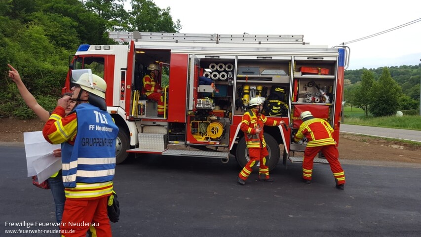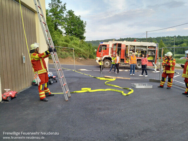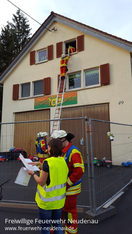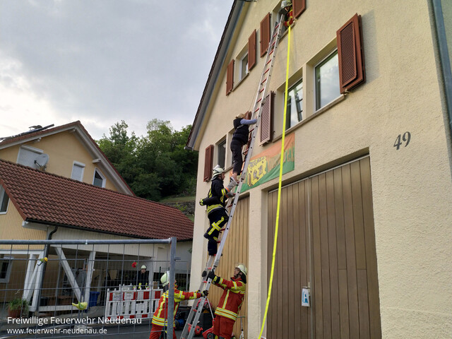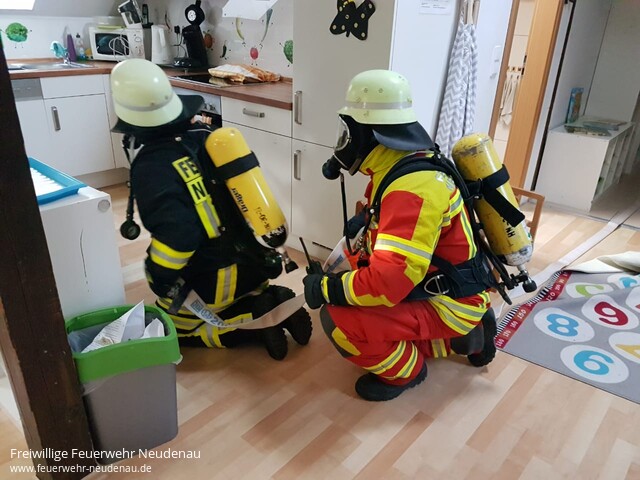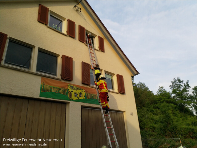 | Eine Übung an der Kindertagesstätte Mauseloch stand auf dem Plan der Einsatzabteilung (EA) Neudenau. Beim Eintreffen des Tanklöschfahrzeuges (TLF 16/25) standen eine Frau und ein Kind an einem Fenster des zweiten Obergeschosses (OG) und riefen um Hilfe. Eine Leiterrettung wurde umgehend eingeleitet. Noch während dieser Maßnahme stellte sich heraus, dass im ersten OG ein Kind vermisst wird. Sofort wurde ein Atemschutztrupp, des zwischenzeitg eingetroffenen, Einsatzleitwagens (ELW1) zur Personensuche vorgeschickt. Je nach Verfügbarkeit, stellt der ELW1 einen weiteren Atemschutztrupp für das TLF 16/25. Im ELW1 sind dafür zwei Atemschutzgeräte verlastet. Ein weiterer Trupp des nun eingetroffenen Gerätewagen-Logistik (GW-L2) wurde vom Eingang auf der Gebäuderückseite zur Brandbekämpgung ins zweite OG vorgeschickt, wo eine Küchenzeile in Brand geraten war. Der Trupp fand den Brandherd und löschte das Feuer. Koordiniert wurde die Übung aus dem ELW1 heraus, wo der Funkkontakt zur Leitstelle gehalten und die Maßnahmen dokumentiert werden. Bewährt hat sich das, in allen entsprechenden Einrichtungen, eingeführte Westensystem. Mitarbeiter der Kita tragen orange Warnwesten und die im Dienst befindliche Leitung eine gelbe Warnweste. So sind die Angestellten sofort für die Feuerwehr erkennbar. Nachdem die Übungsmaßnahmen alle erfolgreich abgeschlossen waren, fand eine Begehung der Einrichtung für alle Kräfte statt. Danach wurde alles abgebaut und die Übung beendet. |