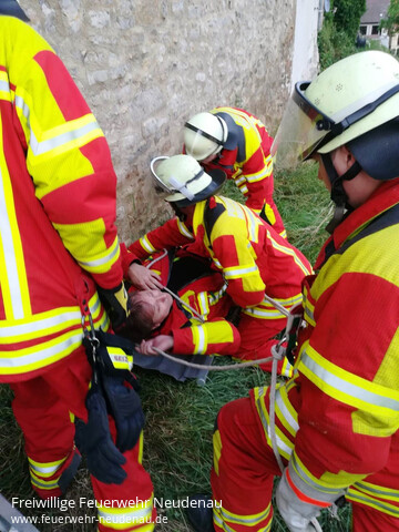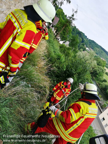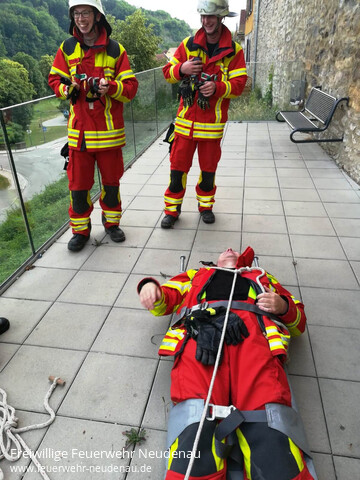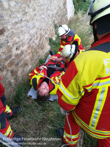 | Die Rettung einer Person, aus dem Hang unterhalb der Stadtmauer, war eines von zwei angenommenen Szenarien der EA Neudenau beim letzten Übungsdienst. Die Person musste entsprechend gesichert und gerettet werden. Die Feuerwehrkräfte mussten sich selbst sichern, um die Rettung ohne Gefahr durchführen zu können. |
