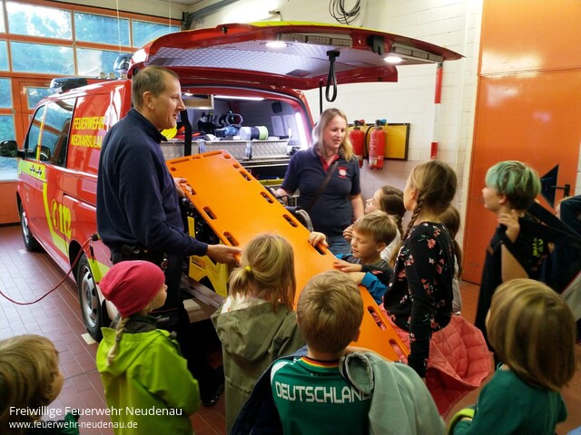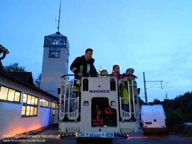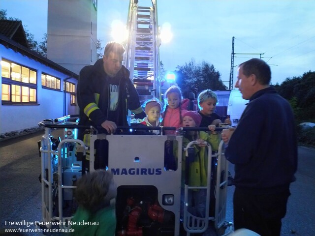 | Einen Ausflug zur Feuerwehr Neckarsulm unternahm die Kinderfeuerwehr mit ihren Betreuern. Vor Ort begrüßte uns der stellvertretende Kommandant Markus Kiy. Mit viel Geduld zeigte er uns die Feuerwache, die Fahrzeuge und erklärte alles. Geduldig beantwortete er alle Fragen und das waren zunächst einmal sehr viele. Das absolute Highlight war dann aber doch eine Fahrt mit der Drehleiter. Jeder nur so hoch er wollte, aber getraut haben sich alle. Nach interessanten zwei Stunden verabschiedeten wir uns bei Markus und seinen Kameraden und bedankten uns mit einem kleinen Geschenk. Im Anschluss, auf der Heimfahrt, sprudelte das Erlebte geradeso heraus aus den Kindern. Noch am Abend und in den folgenden Tagen meldeten sich mehrere Eltern und lobten die Betreuer und deren Engagement. Vielen Dank auch dafür! |