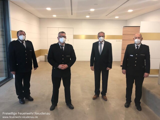 | Der Kreisfeuerwehrverband Heilbronn gratuliert dem neuen Kreisbrandmeister. Bernd Halter wurde heute vom Kreistag einstimmig gewählt. Damit ist er auch der erste hauptamtliche Kreisbrandmeister des Landkreises Heilbronn. Verbandsvorsitzender Reinhold Gall: „Der Kreistag konnte sich bei dieser Wahl auf das nahezu einstimmige Votum der Kommandanten unserer Wehren stützen. Wir als Verband freuen uns auf die Zusammenarbeit mit Bernd Halter. Dem scheidenden Kreisbrandmeister Uwe Vogel danken wir für sein Wirken und die Zusammenarbeit mit dem Verband.“ Bild: v.l.n.r.: stv. KBM Schiefer, neuer KBM Halter, KFV-Vorsitzender Gall, stv. KBM Thoma |
