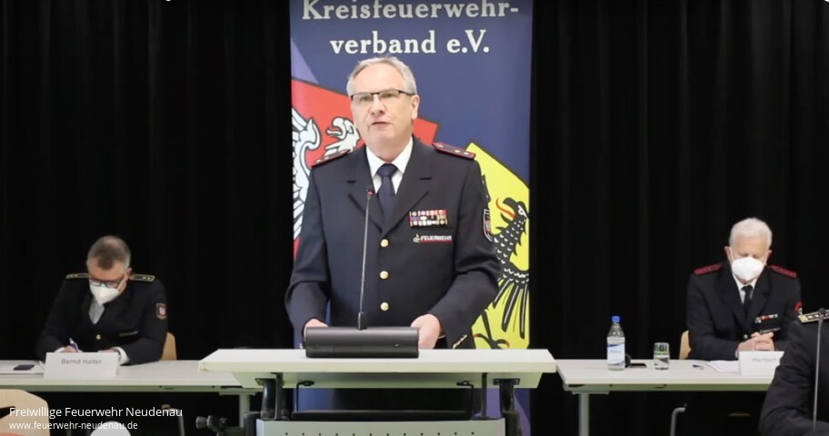 | Die Jahreshauptversammlung des KFV Heilbronn fand in diesem Jahr als Onlineveranstaltung (Stream) statt. Lediglich der Vorstand traf sich unter Einhaltung der Coronavorschriften in Gemmingen. Die Delegierten nahmen an einem Livestream teil. Die Coronapandemie stellte 2020 und stellt immer noch die Feuerwehren im Stadt- und Landkreis Heilbronn und überall anders vor besonderen Herausforderungen. Neben den Einsätzen, die unter Einhaltung von strengen Hygienebedingungen abgearbeitet werden mussten, konnten keine oder nur sehr eingeschränkte Ausbildungs- und Übungsdienste durchgeführt werden. Ohne regelmäßiges Üben werden Defizite entstehen und zunehmen. Aus diesem Grund brennen alle wieder auf Übungs- und Ausbildungsdienste, um dem eigenen Anspruch jederzeit und überall Hilfe leisten zu können, gerecht zu werden. Mit reichlich Kreativität und technischem Sachverstand wurden dennoch verschiedene Formen der Ausbildung umgesetzt. Am heftigsten haben unter den Einschränkungen jedoch die Kinder- und Jugendfeuerwehren gelitten. Keine Übungsabende oder sonstigen Tätigkeiten wie Bastelstunden, Schlauchbootrennen oder Zeltlager. Ein besonderer Dank geht an die Ausbilder die trotz der schwierigen Lage den Kontakt zum Nachwuchs halten. Trotz vielen nicht stattgefundenen Terminen gab es im vergangenen Jahr einige personelle Veränderungen. So hat sich das Medienteam neu um Marcel Karger formiert; Alexander Martz wurde zum Landesjugendsprecher gewählt, außerdem gibt es seit September einen neuen Stellvertreter an der Verbandsspitze: Fabian Müller, der neue Chef der Heilbronner Feuerwehr als Nachfolger von Eberhard Jochim. Seit dem 1.1. dieses Jahrs gibt es auch einen neuen Kreisbrandmeister: Bernd Halter wurde einstimmig gewählt. Was Kameradschaft ausmacht, konnte an Silvester und an Neujahr unter Beweis gestellt werden. In Kroatien gab es ein heftiges Erdbeben, was für die Menschen dort, neben der Coronasituation, eine weitere enorme Belastung war und ist. Der Aufruf die kroatischen Feuerwehren mit Sachmitteln, Gerätschaften und Fahrzeugen zu unterstützen stieß auf ein großes und positives Echo. Bild: Reinhold Gall bei bei der diesjährigen Versammlung (Quelle: Video Screenshot durch KFV Medienteam) |
