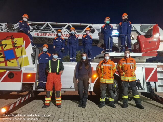 | Hoch hinaus ging es für eine der Gruppen der Jugendfeuerwehr Neudenau am Übungsdienst letzten Freitag. Die Jugendlichen waren zu Gast bei der Freiwilligen Feuerwehr Bad Rappenau und durften die Drehleiter etwas genauer unter die Lupe nehmen. Aufgrund der letzten Übungen unter dem Thema „Mannschaft und Fahrzeuge der Feuerwehr“, sollte ein Ausflug zu einer anderen Feuerwehr die einheitlichen Arbeitsweisen der Feuerwehr und das generell kameradschaftliche Verhältnis verdeutlichen, sowie den Blick auf weitere Fahrzeuge ermöglichen. Schon beim Eintreffen bot sich uns ein beträchtlicher Anblick des auf 32 m ausgefahrenen Leiterparks der Drehleiter. Jeder der Jugendlichen hatte die Möglichkeit Bad Rappenau aus dem Drehleiterkorb heraus von oben zu sehen. So nahmen wir unseren ganzen Mut zusammen und fuhren einzeln mit einem Drehleitermaschinisten aus Bad Rappenau dem dunklen Nachthimmel entgegen. Währenddessen teilten sich die restlichen Jugendlichen in zwei Gruppen auf und inspizierten das Material der Drehleiter, sowie die anderen Fahrzeuge der Feuerwehr Bad Rappenau. Sehr interessant war es die unterschiedlichen Aufgaben der Fahrzeuge erklärt zu bekommen. Hierbei galt es die Ohren zu spitzen und gut aufzupassen, da im Anschluss ein kleines Quiz anstand, welches alle Jugendlichen mit Bravour meisterten. Nach einer gemeinsamen Stärkung machte sich die Gruppe der Jugendfeuerwehr Neudenau wieder auf den Heimweg, wo alle Zuhause viel zu erzählen hatten. Vielen Dank an dieser Stelle an die Kameraden der Feuerwehr Bad Rappenau für eure Zeit und Gastfreundschaft. |