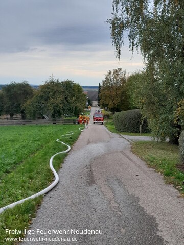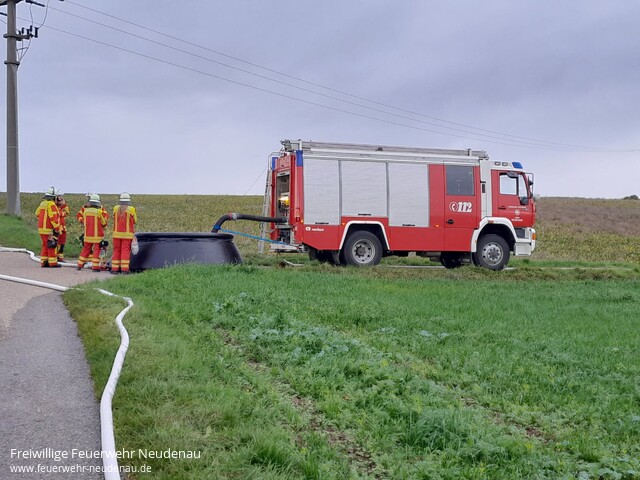 | Am Samstag trafen sich die Mitglieder der Wasserförderkomponente bestehend aus der Einsatzabteilung Neudenau mit dem Gerätewagen Logistik 2 (GW-L2) und die Einsatzabteilung Siglingen mit dem Tragkraftspritzenfahrzeug (TSF) für eine weitere Übung in diesem Jahr. Da bei einer Übung im Mai bereits der einsatztaktische Aufbau sowie die Kommunikation zwischen den Pumpen im Fokus lag (hierfür wurde im Teilort Herbolzheim eine etwa ein Kilometer lange Förderstrecke zwischen der Jagst und den Aussiedlerhöfen im Unheldenweg aufgebaut), konnte dieses Mal die Funktion einiger Gerätschaften der Wasserförderung beübt werden. Hierfür wurde aus dem Löschteich in Reichertshausen das Wasser mittels Schwimmpumpe entnommen und über zwei Tragkraftspritzen zu einem etwa 200 Meter entfernten selbstaufrichtenden Faltbehälter gefördert. Daraus wurde das Tanklöschfahrzeug gespeist. Nachdem die Übungsstrecke aufgebaut war, wurde zwischen den einzelnen Pumpen getauscht, so dass jeder alle Gerätschaften wie Schwimmpumpe, Schlauchbinden oder Faltbehälter ansehen und ausprobieren konnte. Nach etwa drei Stunden Übung war wieder alles einsatzbereit auf den Fahrzeugen verstaut, so blieb noch Zeit, den Abend bei einem kleinen gemeinsamen Vesper abzurunden. |