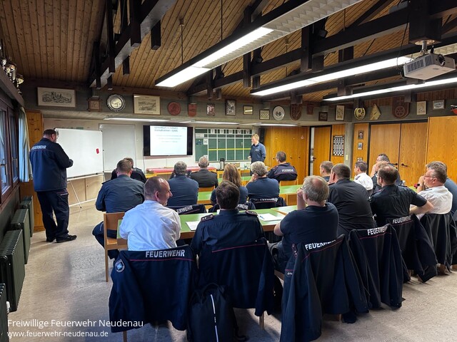 | Am 18.10.2024 und 19.10.2024 hat in den Räumlichkeiten der Feuerwehr Gundelsheim eine Führungskräftefortbildung des Landkreises Heilbronn über das Thema Gefahrstoff-Einsätze bzw. Gefahrstoffersteinsatz stattgefunden. 35 Zugführer aus 17 Landkreisfeuerwehren und 2 Werkfeuerwehren folgten der Einladung. Conrad Wagenbach, Mitglied der Feuerwehr Bad Rappenau, referierte in einem sehr informativen und kurzweiligen Beitrag über die Grundsätze für Feuerwehren an Einsatzstellen mit Gefahrstoffen bzw. gefährlichen Stoffen und Gütern und ging insbesondere auf die Besonderheiten dieser Einsatzstellen ein. Neben dem Theorieteil wurde auch in Planspielen versch. Einsatzszenarien mit gefährlichen Stoffen und Gütern dargestellt und von den Teilnehmern gemeinsam abgearbeitet. Auch die für den Landkreis Heilbronn zuständigen Fachberater für Gefahrstoffe. Sigrid Aßfalg und Dr. Stefan Sendelbach standen für Fragen und Gespräche zur Verfügung In den Pausen stand einer der zwei neuen Abrollbehälter Gefahrgut des Landkreises Heilbronn zur Besichtigung zur Verfügung. |