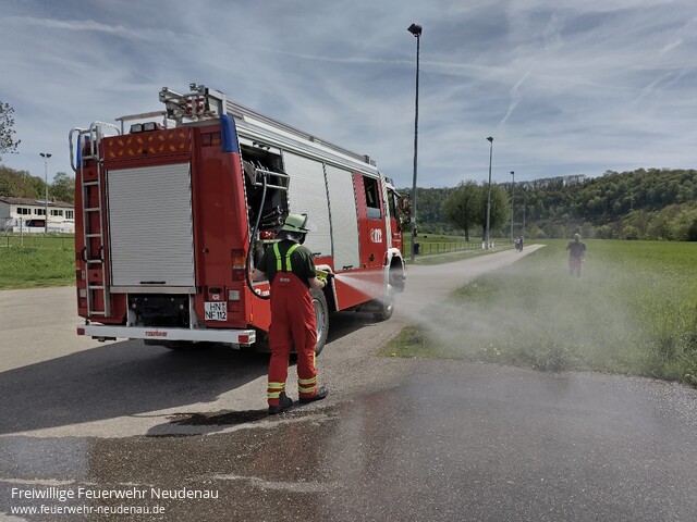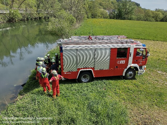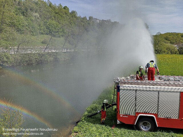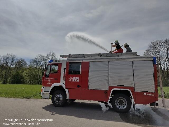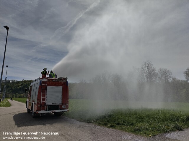 | Zu einer separaten Übung trafen sich Maschinisten der Einsatzabteilung Neudenau am Sonntag, 27.04. Nach etwas Theorie über Sonder- und Wegerechte, Erläuterungen zu Pumpen und anderen Aggregaten, ging es direkt am Fahrzeug weiter. Der praktische Teil fand dann an der Jagst statt. Inbetriebnahme der Pumpe inklusive Ansaugen, wurde dann durch jeden Teilnehmer durchgeführt. Natürlich erfolgte auch Wasserabgabe, vorzugsweise über den Dachmonitor. Im zweiten Teil der Praxis wurde dann die „Pump & Roll“-Funktion beübt, die insbesondere bei Flächen- und Vegetationsbränden zum Einsatz kommt. Hierbei kann das Fahrzeug bei langsamer Fahrt Wasser abgeben. Nach zweieinhalb intensiven Trainingsstunden wurde die Übung bei einem gemeinsamen Mittagessen beendet. |
