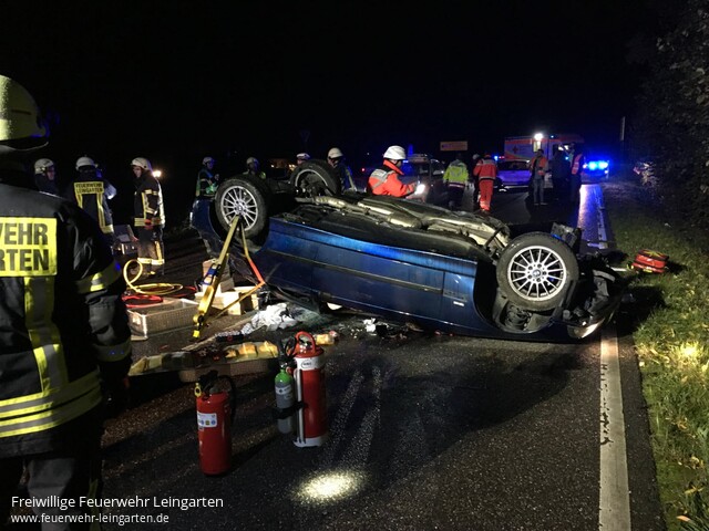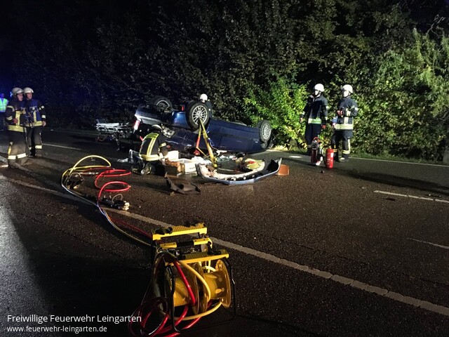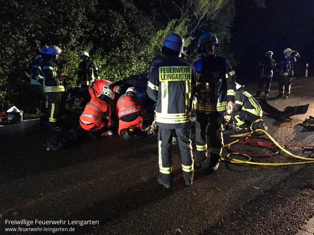 | Um kurzb nach 03:00 Uhr geriet ein junger Fahrer eines BMW auf der K 2154 in einer Linkskurve von der Fahrbahn ab, schanzte über eine Böschung, überschlug sich mehrfach und kam im Anschluss auf der B293 auf dem Dach zum Liegen. Gemäß der Alarm- und Ausrückeordnung fuhren aus Leingarten HLF, TLF, ELW und KdoW an. Aus Lauffen setzten sich ELW, RW und KdoW in Marsch. Beim Eintreffen der ersten Kräfte war die Beifahrerin bereits aus eigener Kraft aus dem PKW gekommen. Die Feuerwehrkräfte stabilisierten das Fahrzeug und öffneten mittels hydraulischem Rettungsgerät die verklemmte Türe, um dem Rettungsdienst Zugang zum Patienten zu schaffen. Beide Insassen wurden vom Rettungsdienst in eine nahegelegene Klinik verbracht. Die Einsatzkräfte leuchteten für den Verkehrsunfallaufnahmedienst die Einsatzstelle aus. Nach gut zwei Stunden konnten der Einsatz beendet werden. |