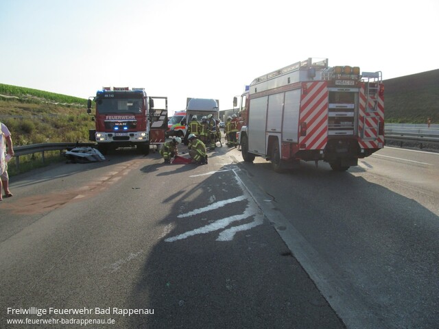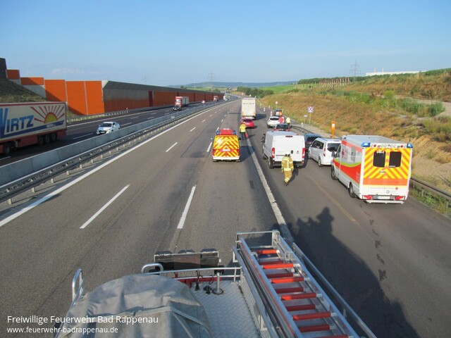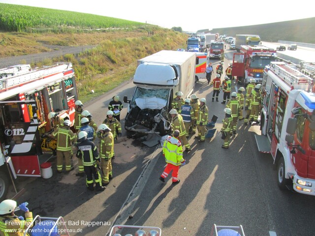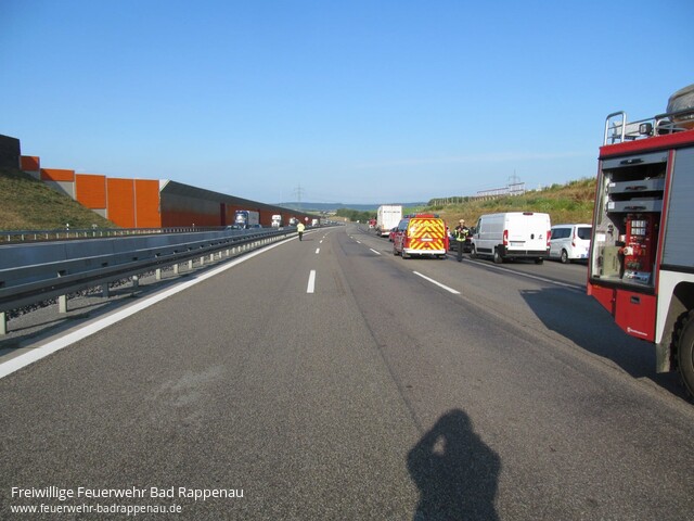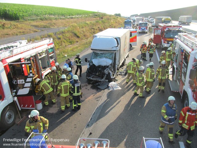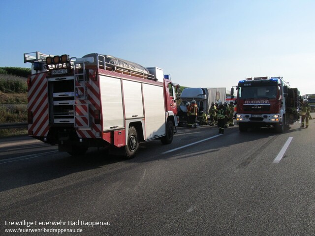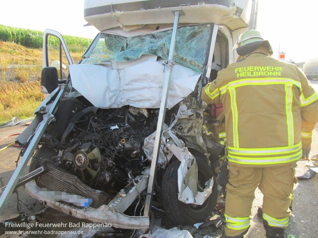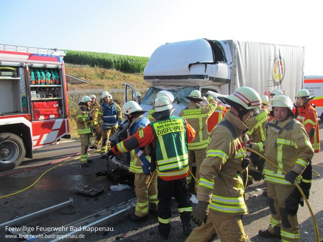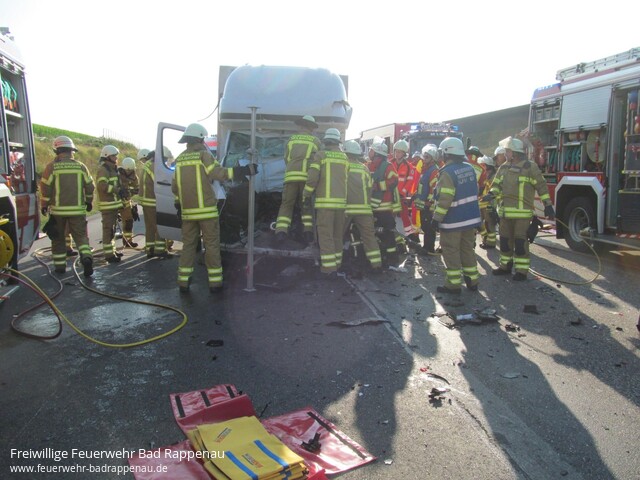 ![]() ![]() ![]() ![]() ![]() | Mit dem Alarmstichwort „Verkehrsunfall LKW“ wurde die Freiwillige Feuerwehr Bad Rappenau auf die A6 in Fahrtrichtung Nürnberg alarmiert. Am Mittwoch gegen 18.30 Uhr staute sich der Lkw-Verkehr auf dem rechten Fahrstreifen der A6 in Fahrtrichtung Nürnberg auf Höhe Heilbronn-Biberach. Der 55-jährige Fahrer eines tschechischen Sprinters bemerkte diesen Umstand zu spät. Obwohl er noch versuchte leicht nach rechts zu lenken, konnte er nicht verhindern, dass er mit großer Wucht gegen die rechte hintere Ecke eines Sattelzuges prallte. Dabei wurde der Fahrer schwerst eingeklemmt. Unter Absprache mit dem anwesenden Rettungsdienst und Zusammenarbeit mit der Feuerwehr Heilbronn wurde der Fahrer mittels schwerem hydraulischen Rettungsgerät aus dem Fahrzeugwrack befreit. Anschließend wurde der Fahrer dem Rettungsdienst übergeben. Jedoch erlitt der Fahrer bei dem Unfall so schwere Verletzungen, dass er diesen noch an der Einsatzstelle erlag. Die Freiwillige Feuerwehr Bad Rappenau war insgesamt mit 5 Fahrzeugen und 22 Mann im Einsatz. Ebenfalls war die Feuerwehr Heilbronn vor Ort. Des Weiteren waren mehrere Notärzte, Polizeistreifen, Rettungstransportwägen sowie ein Rettungstransporthubschrauber im Einsatz. | |||||||||