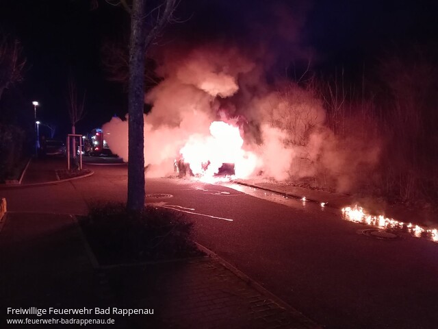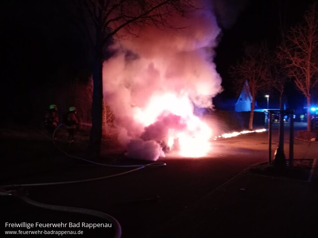 ![]() ![]() | Am gestrigen Abend wurden wir zu einem PKW-Brand in Fürfeld alarmiert. Beim Eintreffen stand ein Mercedes-Kombi mit Dieselmotor in Vollbrand. Zusätzlich lief brennender Kraftstoff den Berg hinunter, was eine besondere Herausforderung für die Einsatzkräfte darstellte. Zur Brandbekämpfung wurden insgesamt drei C-Rohre eingesetzt: Zwei zur direkten Bekämpfung des Fahrzeugbrandes und eines, um das auslaufende und brennende Dieselgemisch zu löschen. Während der Löscharbeiten kam es zu zwei kleineren Explosionen, vermutlich verursacht durch verbrennende Leichtmetallteile. Da Kraftstoff mit dem Löschwasser in die Kanalisation gelangte, wurde umgehend die örtliche Kläranlage verständigt. Zusätzlich alarmierten wir die Rufbereitschaft der Stadt, um die erforderlichen Maßnahmen zur Straßenreinigung einzuleiten. Nach Abschluss der Löscharbeiten und der Übergabe der Einsatzstelle an die zuständigen Behörden konnte der Einsatz beendet werden. | ||||