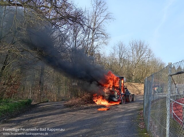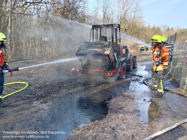![]() ![]() | Um 13:41 Uhr wurde die Feuerwehr Bad Rappenau zu einem gemeldeten Fahrzeugbrand auf den Parkplatz am Waldstadion in Bad Rappenau alarmiert. Vor Ort stellte sich heraus, dass ein Radlader in Vollbrand stand. Unter Atemschutz wurde umgehend mit zwei C-Rohren die Brandbekämpfung eingeleitet und das Feuer rasch gelöscht. Zur Sicherstellung der Löschwasserversorgung wurde zusätzlich das Tanklöschfahrzeug der Abteilung Süd alarmiert. Da das Löschwasser durch den Brand mit Diesel verunreinigt wurde, haben wir es mithilfe von Bindemittel aufgefangen. Im weiteren Verlauf verständigten wir die technische Rufbereitschaft des Hochbauamts, die sich um die Beseitigung des ausgebrannten Radladers und die Reinigung der Einsatzstelle kümmerte. | ||||||