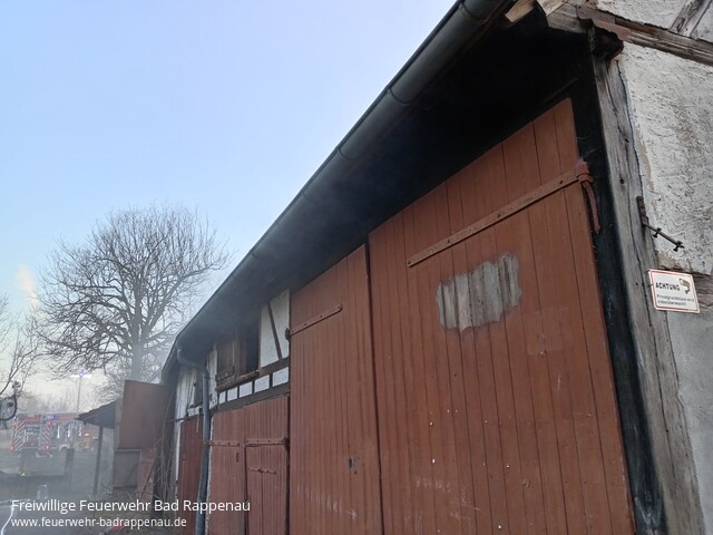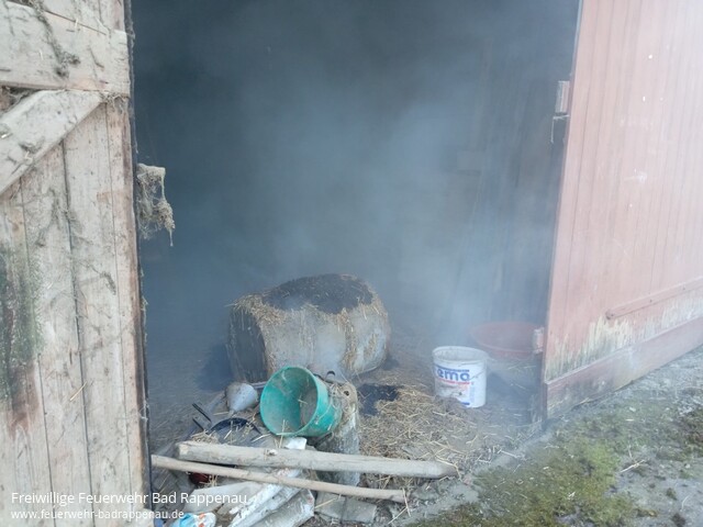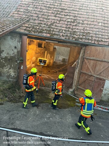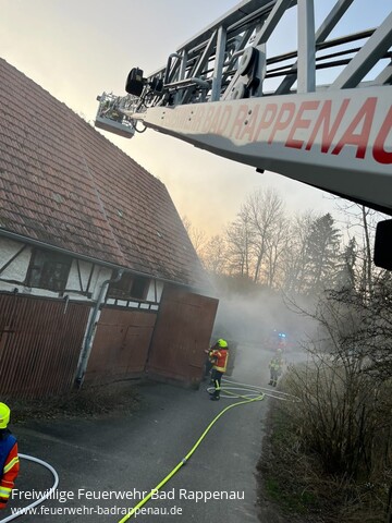 ![]() ![]() ![]() ![]() | Die Feuerwehr Bad Rappenau wurde am Samstagabend um 17:34 Uhr mit dem Einsatzstichwort „Rauchentwicklung Wohngebäude“ nach Bad Rappenau-Zimmerhof alarmiert. In der Guttenbergstraße wurde an einem Gebäude Rauch gemeldet. Beim Eintreffen des Einsatzleiters konnte die Rauchentwicklung bestätigt werden, weshalb mit dem Eintreffen des ersten Löschfahrzeugs unverzüglich die Brandbekämpfung durch zwei Trupps unter Atemschutz eingeleitet wurde. Nachdem sich die Einsatzkräfte Zugang zum Gebäude verschafft hatten, konnte im Inneren eine kleine Brandstelle lokalisiert und abgelöscht werden. Brennendes Stroh hatte eine erhebliche Rauchentwicklung verursacht. Zur Sicherheit wurde die Drehleiter in Stellung gebracht, um das Dach auf mögliche weitere Brandstellen zu überprüfen. Nachdem das Feuer schnell gelöscht war, wurde parallel ein Trupp zur Personensuche durch das Gebäude geschickt, da unklar war, wodurch der Brand entstanden war. Glücklicherweise wurde niemand gefunden, und es gab keine Verletzten. Mithilfe eines Druckbelüfters wurde das Gebäude anschließend komplett entraucht. Danach wurde es dem Betreiber übergeben, während die Polizei die weiteren Ermittlungen übernahm. Die Feuerwehr Bad Rappenau war mit fünf Fahrzeugen und rund 30 Einsatzkräften eine Stunde im Einsatz. Ein besonderer Dank gilt der aufmerksamen Bevölkerung, die das Feuer schnell gemeldet hat! | ||||||