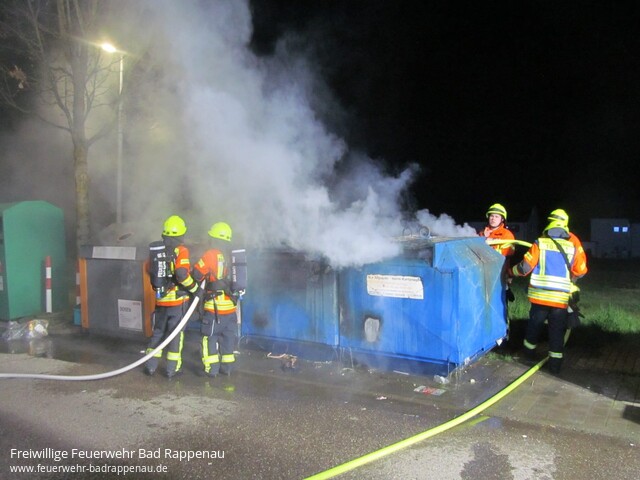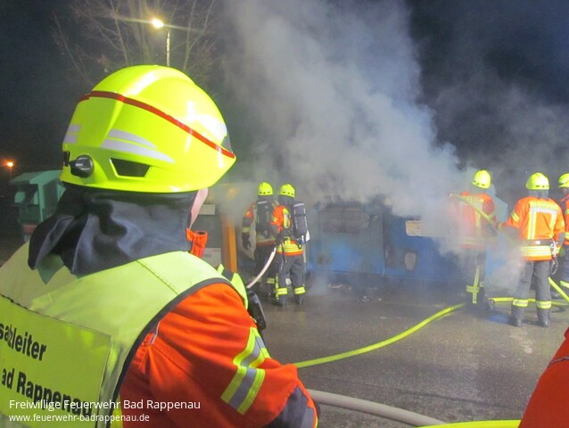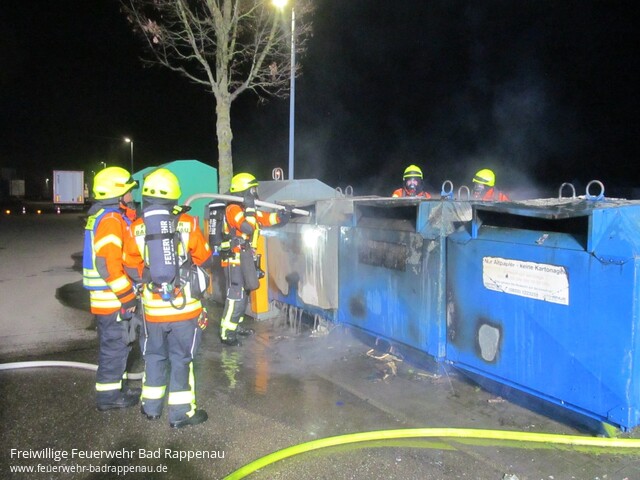 ![]() ![]() ![]() | Während die meisten bereits die ersten Erlebnisse des Tages verarbeiteten und ins Träumen versanken, erwachten im Industriegebiet Fürfeld zeitgleich und urplötzlich mehrere Feuer in Müllcontainern. Es gelang uns innerhalb weniger Minuten, die Flammen einzudämmen und schließlich mit viel Wasser vollständig zu löschen. Im Einsatz waren zwei Trupps unter Atemschutz sowie zwei C-Rohre. | |||||||