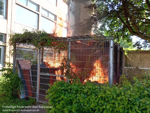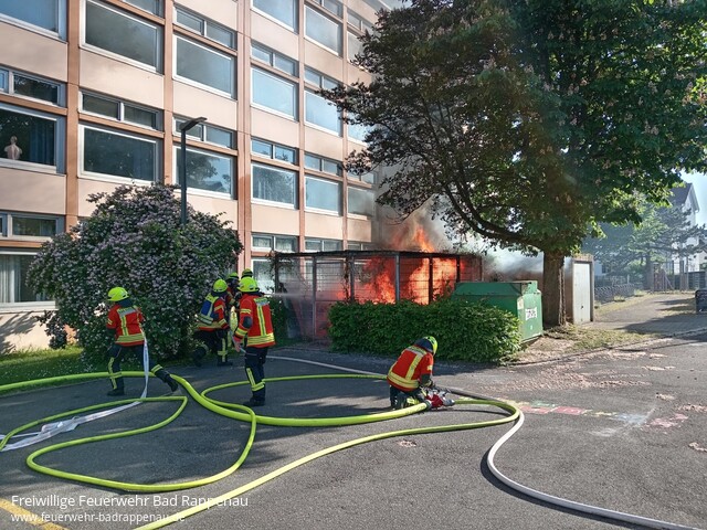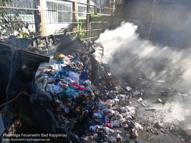 ![]() ![]() ![]() ![]() | Noch bevor die Einsatzkräfte vom vorherigen Mülleimerbrand zur Feuerwache zurückgekehrt waren, informierte uns die Leitstelle Heilbronn über Funk über einen weiteren gemeldeten Mülleimerbrand an der Verbundschule in Bad Rappenau. Die Besatzung des HLF 20 drehte um und machte sich unmittelbar auf den Weg zur neuen Einsatzstelle. Nur wenige Minuten später trafen die ersten Kräfte ein. In einer Einhausung standen mehrere Mülltonnen bereits in Vollbrand. Ein Trupp unter Atemschutz begann umgehend mit der Brandbekämpfung. Dabei wurden auch angrenzende Gebäudeteile, insbesondere eine Hauswand, gekühlt und die Flammen erfolgreich eingedämmt. Nach dem Öffnen der Einhausung konnten Glutnester auseinandergezogen und vollständig abgelöscht werden. Während der Löscharbeiten wurde das Einsatzstichwort erhöht, um zusätzliche Kräfte zur Sicherstellung der Wasserversorgung sowie zur Belüftung der betroffenen Schulräume nachzualarmieren. Durch teils gekippte Fenster war erheblicher Rauch ins Gebäude eingedrungen. Die Polizei war mit drei Streifenwagen vor Ort und hat die Ermittlungen aufgenommen. Im Raum steht der Verdacht auf Brandstiftung - insbesondere aufgrund der zeitlichen und räumlichen Nähe der beiden Brände. | ||||||