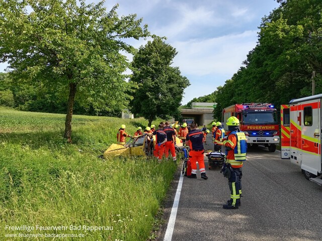 ![]() ![]() | Kurz vor 10 Uhr wurden die Abteilungen Bad Rappenau und Grombach zu einem gemeldeten Verkehrsunfall auf der K2142 zwischen Bad Rappenau und Kirchardt alarmiert. Ein Autofahrer war infolge des Unfalls in seinem Fahrzeug verletzt eingeschlossen, jedoch nicht eingeklemmt. Der Rettungsdienst übernahm die erste medizinische Versorgung, während wir mithilfe eines hydraulischen Spreizers die Beifahrertür öffneten. Anschließend unterstützten wir den Rettungsdienst bei der schonenden Rettung des Fahrers aus dem Fahrzeug und übergaben die Einsatzstelle anschließend an die Polizei. Wir wünschen dem Verunfallten an dieser Stelle eine vollständige und schnelle Genesung. | ||||||