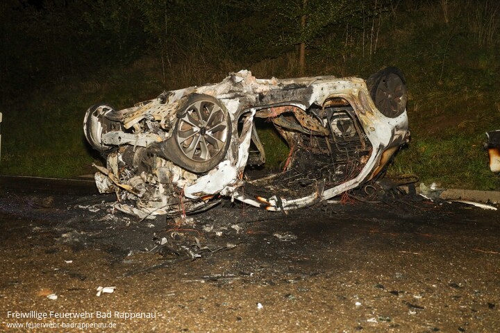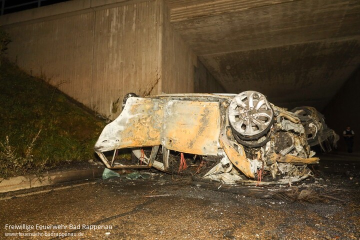 ![]() ![]() | Mit dem Alarmstichwort „Verkehrsunfall PKW“ wurden die Abteilungen Süd und Bad Rappenau auf die K2041 zwischen Treschklingen und Fürfeld alarmiert. Nach ersten Erkenntnissen war der Pkw, von Treschklingen kommend in Richtung Fürfeld, alleinbeteiligt nach links von der Fahrbahn abgekommen. Im weiteren Verlauf kollidierte er mit dem Brückenbauwerk der BAB A6 und überschlug sich. Noch während der Anfahrt der Einsatzkräfte wurde bestätigt, dass der Pkw im Vollbrand stand. Die ersteintreffenden Fahrzeuge der Abteilung Süd begannen unverzüglich mit der Brandbekämpfung mittels zweier C-Rohre. Für die allein im Fahrzeug befindliche Person kam jedoch jede Hilfe zu spät. Die Feuerwehr leuchtete anschließend die Einsatzstelle für die Polizei aus und unterstützte im weiteren Verlauf bei der Bergung der Person. Die Feuerwehr Bad Rappenau war mit insgesamt 6 Fahrzeugen und rund 25 Einsatzkräften im Einsatz. Bilder zur Verfügung gestellt von Einsatz-Report24 | |||||||||