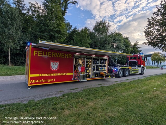 ![]() ![]() | Die Leitstelle Heilbronn alarmierte den Gefahrstoffzug der Feuerwehr Bad Rappenau zu einem Gebäudebrand in Schwaigern-Stetten. Ein Industriegebäude stand in Brand; zum Zeitpunkt der Alarmierung war unklar, ob sich darin gefährliche Stoffe befanden. Nach dem Eintreffen unseres Gefahrstoffzugs in Stetten wurde nach rund 45 Minuten durch die Einsatzleitung die Einsatzbereitschaft für den Gefahrstoffzug – und damit auch für die Kräfte der Feuerwehr Bad Rappenau – aufgehoben. Wir konnten ohne weitere Tätigkeiten wieder nach Bad Rappenau zurückkehren. Allen weiteren Einsatzkräften vor Ort wünschen wir eine erfolgreiche Brandbekämpfung und dass alle gesund vom Einsatz zurückkehren! | |||||||