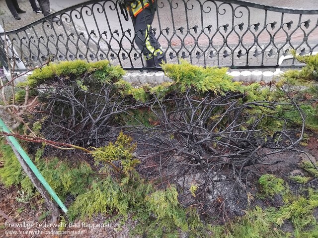 ![]() | Mit dem Alarmstichwort „Wohnungsbrand“ wurden die Abteilungen Grombach, Heinsheim, Obergimpern sowie die Abteilung Bad Rappenau nach Grombach alarmiert. Vor Ort konnte die Lage schnell konkretisiert und entschärft werden. Es handelte sich um eine brennende Thujahecke. Diese wurde durch einen Trupp unter Atemschutz mittels C-Rohr zügig abgelöscht. Alle weiteren anrückenden Einsatzkräfte konnten daraufhin die Anfahrt abbrechen. Insgesamt waren sieben Fahrzeuge und rund 30 Einsatzkräfte im Einsatz. | |||||||