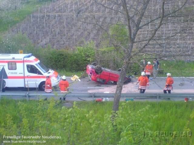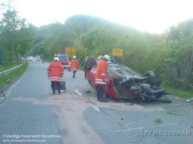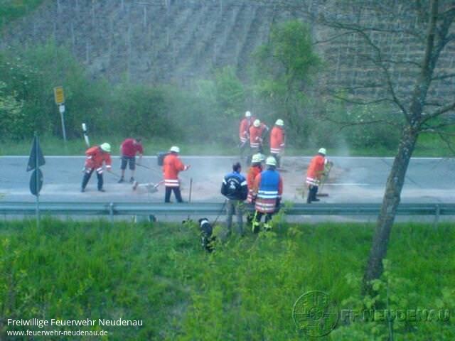 ![]() ![]() ![]() ![]() ![]() | „Auslaufender Kraftstoff" nach Verkehrsunfall war die Alarmmeldung für die Abteilung Siglingen am Sonntag, 04. Mai 2008, um 20.10 Uhr. Neben dem TSF Siglingen rückte zunächst der Kommandowagen Neudenau mit aus. Beide erreichten die Einsatzstelle um 20.17 Uhr. Dort bot sich folgendes Bild: ein PKW lag auf dem Dach, ein Notarztwagen aus Möckmühl war bereits vor Ort, die zwei Insassen konnten sich Gott sei Dank selbst aus dem Fahrzeug befreien. Ein zweiter Rettungswagen war ebenfalls auf der Anfahrt. Da der Brandschutz sichergestellt werden musste und zusätzlicher Ölbinder von Nöten war, wurde das Tanklöschfahrzeug aus Neudenau nachgefordert, dieses erreichte die Einsatzstelle um 20.23 Uhr. Mittels Schnellangriff vom TLF und einem Feuerlöscher wurde dann der Brandschutz sichergestellt, während die Kameraden aus Siglingen die Fahrbahn mit Ölbindemittel abstreuten. Die zwei Verletzten (ein Schwer- und ein Leichtverletzter) wurden mit den Rettungswagen in ein Krankenhaus gebracht. Nachdem das Unfallfahrzeug von einem Abschleppunternehmen geborgen war und die Straße wieder befahrbar war, gab die Polizei die Einsatzstelle frei, die Feuerwehr Neudenau konnte den Einsatz um 21.15 Uhr beenden. gez. Uwe Amann, Pressesprecher | ||||||