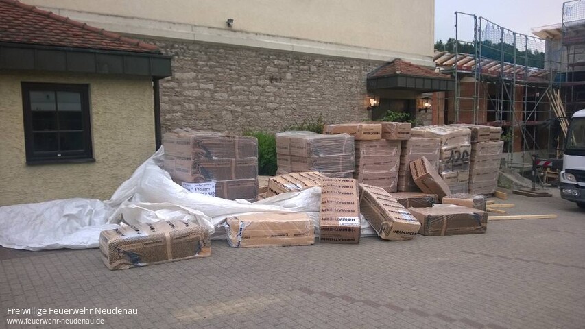 | Bei einer kurzen, extremen Windböe wurde Dämmmaterial, das neben dem Feuerwehrhaus gelagert war, erfasst und im Parkplatzbereich verteilt. Es wurden kurzfristig einige Feuerwehrleute alarmiert, um das Material aufzusammeln und im Erweiterungsbau zwischenzulagern. Die restlichen Lager wurden abgedeckt und befestigt. |