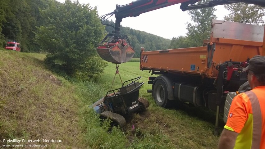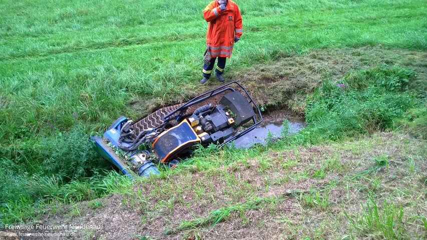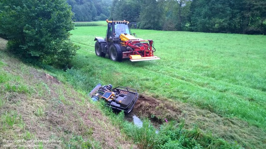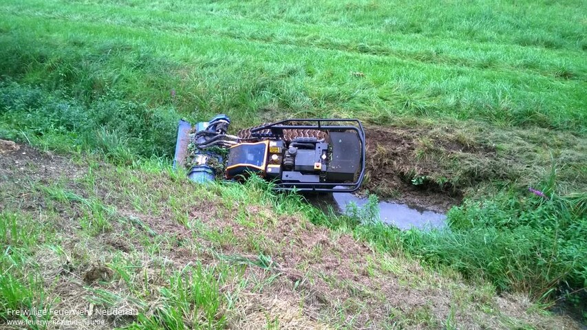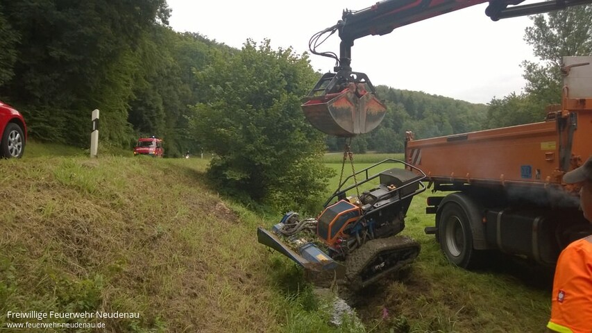 ![]() ![]() ![]() ![]() ![]() | Mit Alarmstichwort „Gewässerverunreinigung ** L526 ** Neudenau ** in der Schefflenz“ wurde die Einsatzabteilung Neudenau alarmiert. Die Abfrage bei der Leitstelle in Heilbronn ergab, dass sich eine Maschine, ähnlich einer Agria, in der Schefflenz befinden soll. Genauer konnte die Örtlichkeit nicht verifiziert werden. Aufgrund der Meldung rückten Kommandowagen (KdoW), Tanklöschfahrzeug (TLF 16/25) und Einsatzleitwagen (ELW1) aus. Ungefähr einen Kilometer vor der Kreisgrenze wurde in einem wasserführenden Graben, also nicht in der Schefflenz selbst, eine selbstfahrende Arbeitmaschine gefunden. Es handelte sich um einen fernsteuerbaren, kettengetriebenen Rasenmäher. Aufgrund der Gesamtumstände lag der Verdacht nahe, dass dieses Gerät der Straßenmeisterei gehört. Noch bevor dies fernmündlich geklärt werden konnte, kamen Mitarbeiter der Straßenmeisterei mit einem Lkw angefahren und bestätigten dies. Mit dem Kran am Lkw der Straßenmeisterei wurde die Mähmaschine (ca. eine Tonne Eigengewicht) aus dem Schlick gehoben und dann abtransportiert. Betriebsmittel waren glücklicherweise keine ins Wasser gelaufen, so dass die Feuerwehr nicht mehr tätig werden musste. Einsatzende war gegen 14.30 Uhr. | ||||