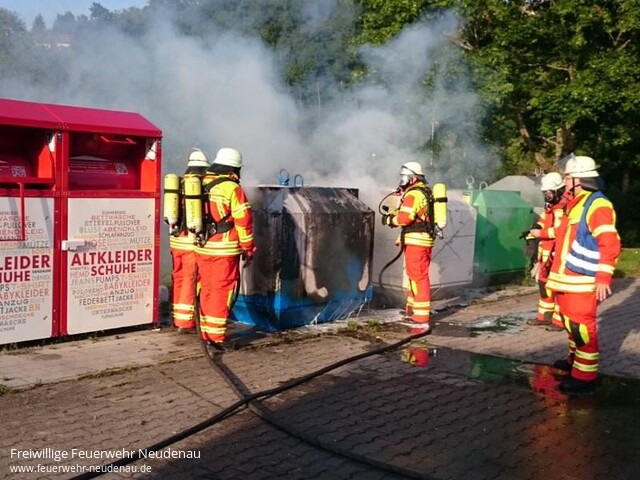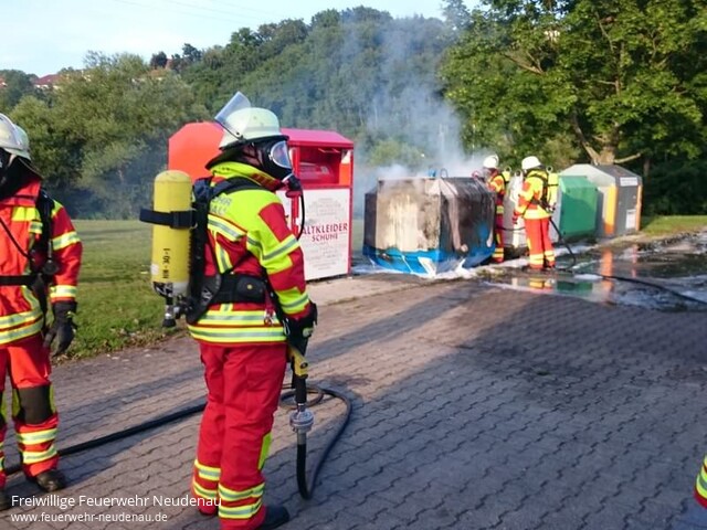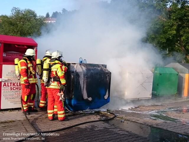 ![]() ![]() ![]() | Genau einen Tag nach dem letzten Brand wurden die Einsatzabteilungen Neudenau und Herbolzheim wieder zum Herbolzheimer Sportplatz alarmiert, weil dort erneut ein Container brannte. Beim Eintreffen stand der gleiche Container wie am Vortag in Vollbrand. Der Containerinhalt wurde mit einer Schnellangriffsleitung abgelöscht und anschließend wieder mit Schaum abgedeckt. Mit der Wärmebildkamera überprüfte man im Anschluss die Maßnahmen auf ihren Erfolg. Einsatzende: 20.30 Uhr | |||