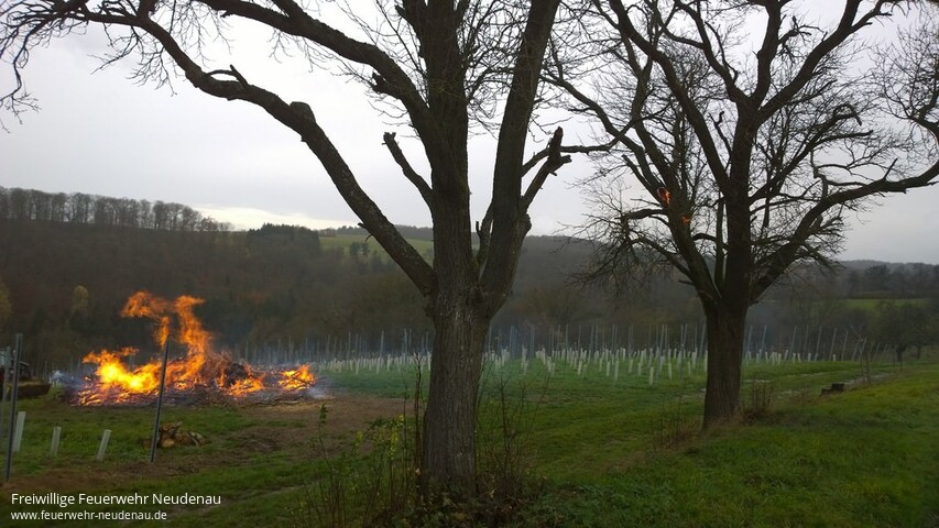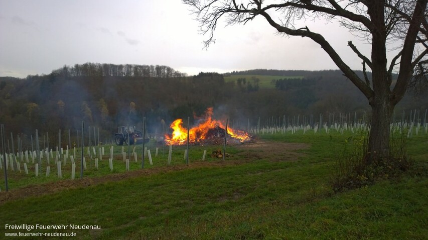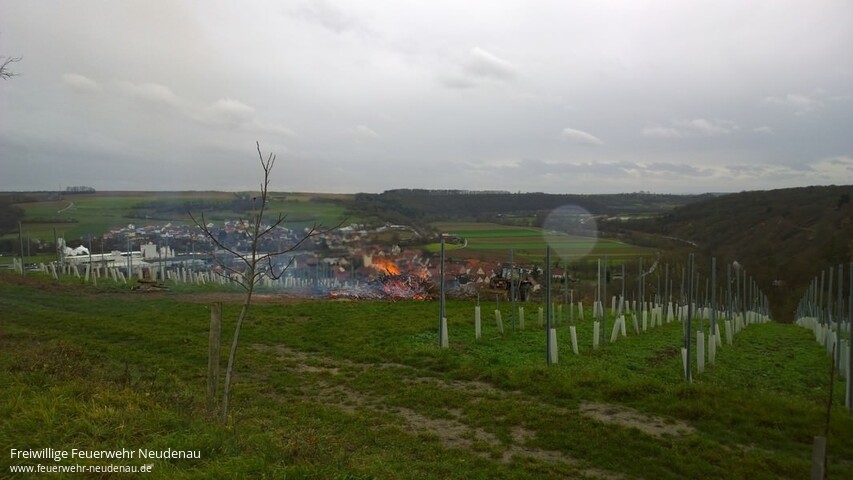 ![]() ![]() ![]() | Mit dem Alarmstichwort „Flächenbrand“ alarmierte die Integrierte Leitstelle (ILS) Heilbronn die Einsatzabteilungen Siglingen und Neudenau. Gemeldet war ein Flächenbrand im Gewann Hoher Berg, oberhalb des Sportplatzes Siglingen. Bereits auf der Anfahrt war ein sehr großes Feuer zu sehen, was auch die Vermutung zuließ, dass das Feuer außer Kontrolle geraten war. Vor Ort brannte beaufsichtigt ein sehr großer Reisighaufen. Zwar war außen herum alles nass, jedoch ging stürmischer Wind, der eigentlich ein Verbrennen des Reisigs verboten hätte. Zudem war in ca. 10 Metern Entfernung des Reisigfeuers ein Baumast in Brand geraten. Der Ast wurde gelöscht und das Herunterbrennen des Feuers solange abgewartet, bis davon keine Gefahr mehr ausging. Einsatzende war gegen 10.10 Uhr. | |||||
