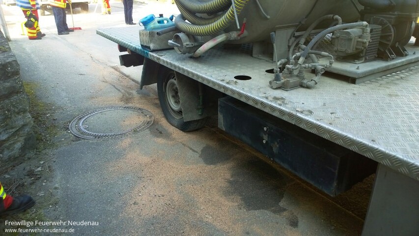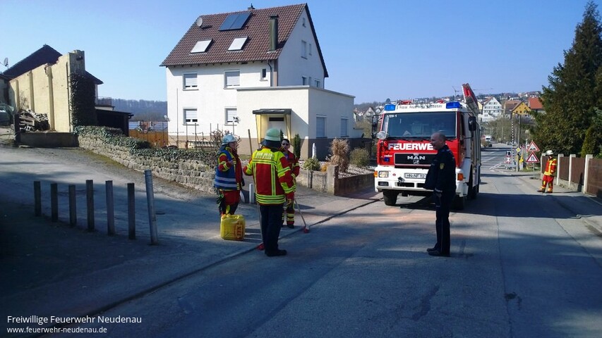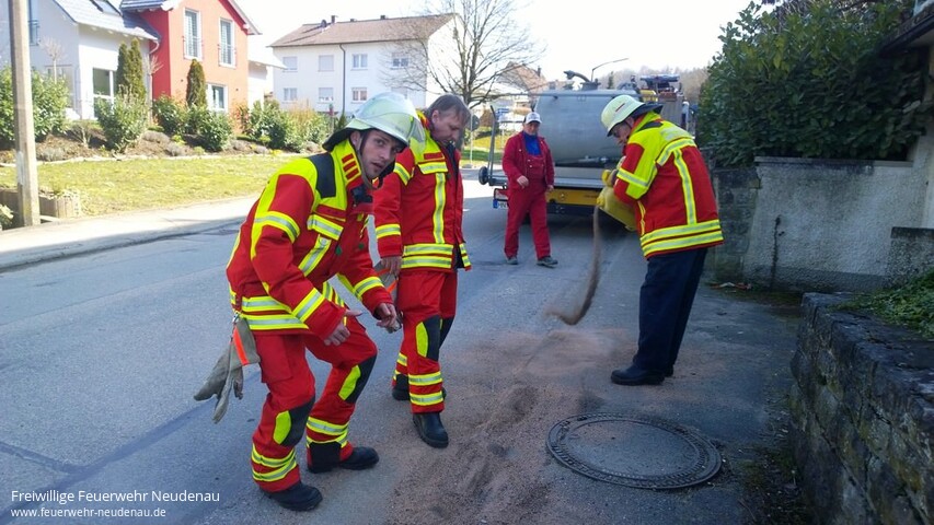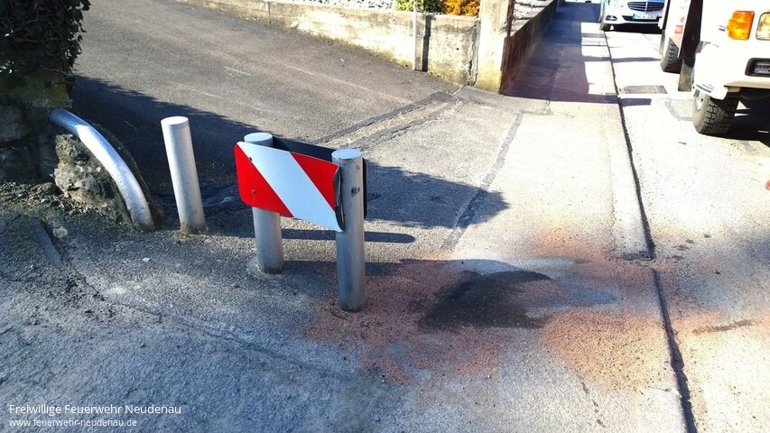 ![]() ![]() ![]() ![]() ![]() | Wegen auslaufenden Hydrauliköls wurden die Einsatzabteilungen Neudenau und Herbolzheim in die Römerstraße alarmiert. Ein Klein-Lkw hatte sich an einem Verkehrszeichen die Füllstandsanzeige des Hydrauliktanks abgerissen. Das nur eine ca. 10 Meter lange Ölspur und zwei größerer Ölflecken die Folge waren, ist der Geistesgegenwart des Fahrers zu verdanken. Er hatte einen Eimer unter die Leckage gestellt, so dass das weiter auslaufende Öl bis zum Eintreffen der Feuerwehr aufgefangen wurde. Der Tank konnte vor Ort abgedichtet werden. Das Öl auf der Straße und auf dem Gehweg wurde mittels Ölbindemittel gebunden und zusammengekehrt. Das eintreffende LF 10/6, mit den Feuerwehrkameraden aus Herbolzheim, musste nicht mehr eingesetzt werden. Einsatzende war gegen 14.45 Uhr. | ||||