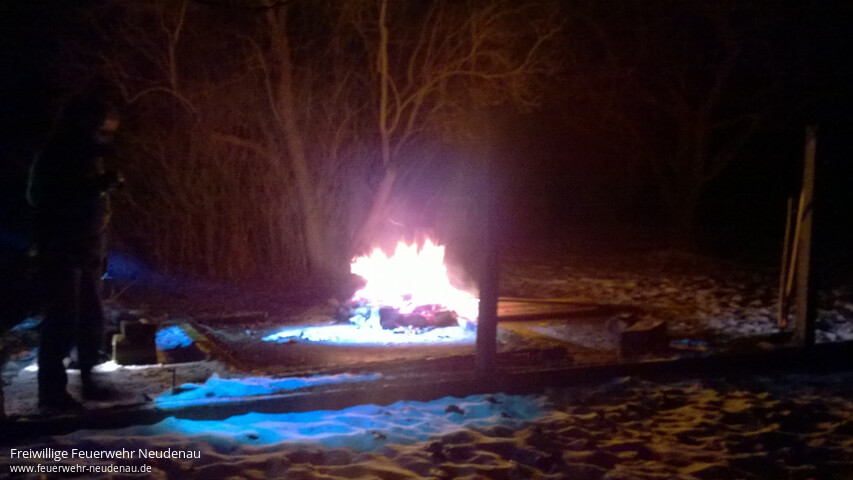 ![]() ![]() | Mit dem Alarmstichwort „Zimmerbrand“ in der Grundschule Siglingen alarmierte die Integrierte Leitstelle Heilbronn (ILS HN) alle drei Einsatzabteilungen (EA) der Neudenauer Feuerwehr. Nachdem das zuerst eintreffende Löschfahrzeug der EA Siglingen an der Schule nichts festellen konnte, wurde der Kreis um die angebliche Einsatzstelle größer gezogen und noch ein Passant befragt. Schließlich konnte das Feuer in einem Garten, hinter einem Haus der Seitenstraße, ausfindig gemacht werden. Ein junger Mann hatte zur Nachtzeit, weithin sichtbar und unerlaubt, Holzabfälle verbrannt. Die Feuerwehr konnte ohne weitere Tätigkeit wieder abrücken. Im Einsatz waren ca. 35 Kräfte bis ca. 24 Uhr. | ||||||||