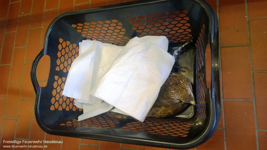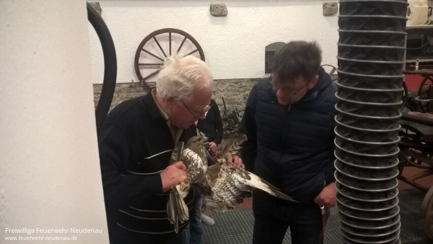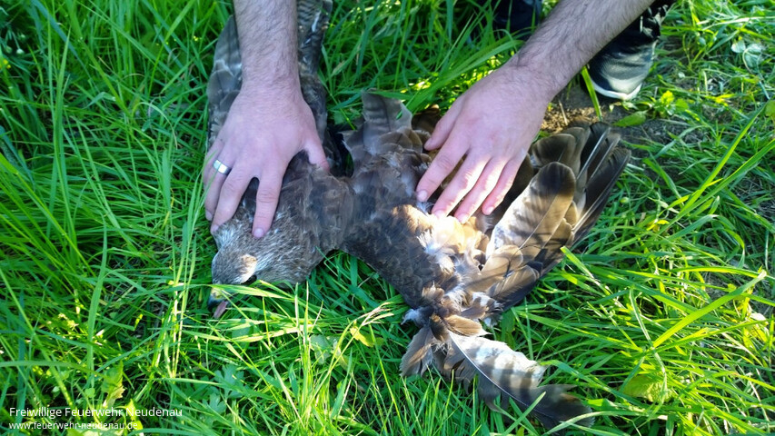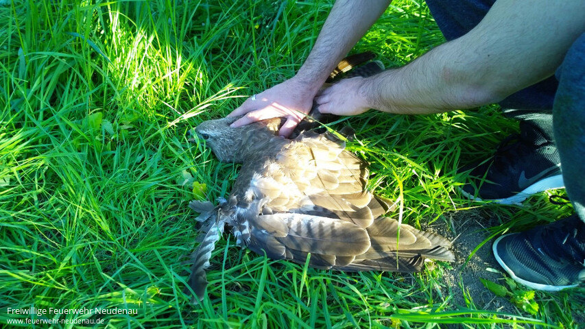 ![]() ![]() ![]() ![]() ![]() | Tolle „Ersthelfer“ hatte ein ca. einjähriger Mäusebussard. Das Tier hatte sich über der Jagst in einer, in einem Baum hängenden, Angelschnur verfangen. Die Helfer wurden von der anderen Jagstseite aus auf das Tier aufmerksam, weil es versuchte sich aus seiner Lage zu befreien. Sie begaben sich auf die andere Flußseite. Vor Ort entschieden sie sich einen Notruf abzusetzen und begangen aber sogleich mit einer Stange den Bussard ans Ufer zu holen. Die Integrierte Leitstelle (ILS) Heilbronn alarmierte daraufhin die Einsatzabteilung Neudenau mit Stichwort „Tiernotlage“. Bis zum Eintreffen der Feuerwehr hatten es die Helfer geschafft den völlig erschöpften Bussard ans Ufer zu bringen. Blieb noch das Organisatorische zur weiteren Versorgung des Vogels zu regeln. Über die ILS Heilbronn konnte die Greifvogelstation Bad Friedrichshall verständigt werden. Ein Sachverständiger der Greifvogelstation meldet sich dann telefonisch beim Einsatzleiter vor Ort. Die Feuerwehr nahm den Bussard mit ins Feuerwehrhaus, wo er dann an den Sachverständigen übergeben werden konnte. Bei der ersten Untersuchung wurde festgestellt, dass der Vogel nichts gebrochen hat, aber noch einen Blinker mit Widerhaken im Flügel steckte. Dieser wurde ihm noch heute in der Greifvogelstation operativ entfernt. Nach etwas „Krankenhausaufenthalt“ sollte er dann auch wieder fliegen können. Einsatzende war gegen 20 Uhr. | |||