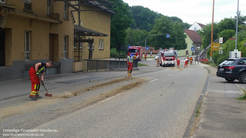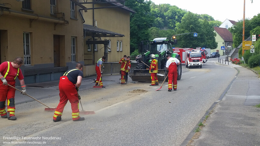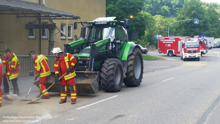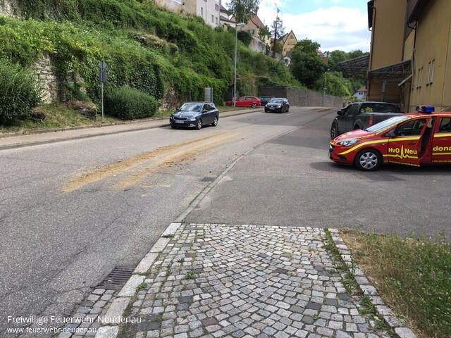 ![]() ![]() ![]() ![]() | Mit dem Stichwort „Verkehrssicherungsmaßnahmen“ wurde die Einsatzabteilung Neudenau am 24. Juni um 10:19 Uhr zum ersten Mal an diesem Samstag alarmiert. In der Siglinger Straße waren auf etwa 100 Metern Bauerde auf der Straße verteilt und stellten eine Gefährdung des fließenden Verkehrs dar. Daher entschied man sich dafür, die Straße kurzzeitig zu sperren, auch um eigene Kräfte zu schützen, und die Erde mit Besen und Schaufeln von der Straße zu entfernen. Der Bauhof unterstützte mit dem Frontlader. Nach etwa 20 Minuten konnte die Straße wieder freigegeben werden. Der Verursacher konnte inzwischen durch die Polizei ermittelt werden. Bei den Maßnahmen kam es zu einem kleinen Zwischenfall: ein Fahrzeugführer umfuhr die beiden Großfahrzeuge der Feuerwehr, die eigentlich zur Absperrung quer über die Fahrbahn standen. Im dauerte es wohl zu lange. Er muss nun mit Ermittlungen durch die Polizei rechnen, da wir das entsprechend gemeldet haben. | ||||