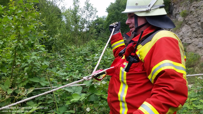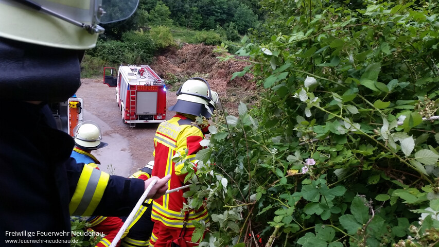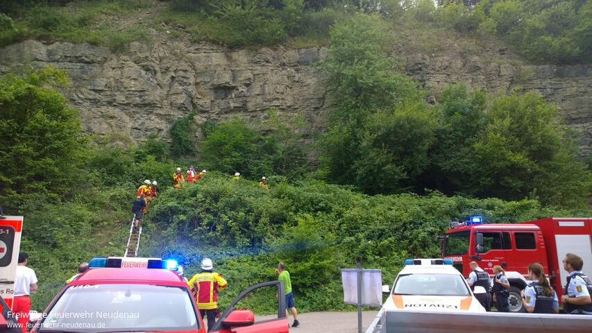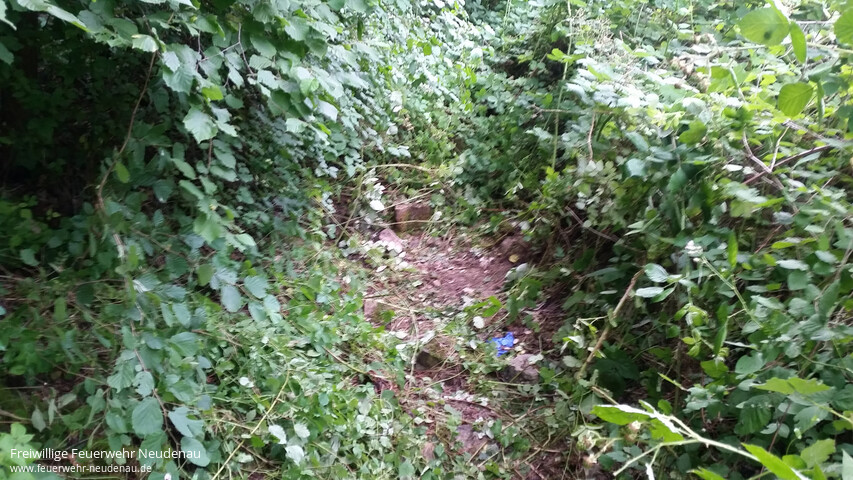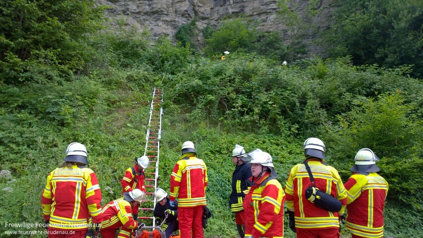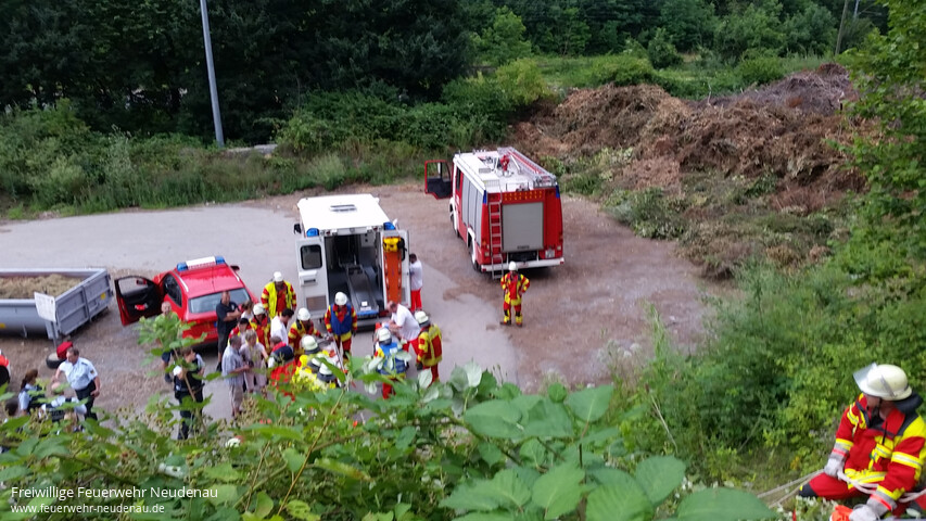 ![]() ![]() ![]() ![]() ![]() | Zur „Hilfeleistung für Rettungsdienst“ wurde die Einsatzabteilung Neudenau am Sonntagabend alarmiert. Kurz zuvor war schon die HvO-Gruppe alarmiert wurden, hier mit dem Stichwort „Verkehrsunfall“. Seit der letzten Nacht war ein Jugendlicher aus einem Neudenauer Stadtteil vermisst. Mehrere Freunde und Bekannte machten sich im Laufe des Nachmittags auf die Suche. Irgendwann konnte der Jugendliche auf Zurufen im Bereich des Neudenauer Häckselplatzes / Recyclingshofes ausfindig gemacht werden - in sehr unwegsamen Gelände: etwa 5 Meter über der Zufahrt, direkt unterhalb eines Steilhangs des ehemaligen Steinbruchs. Die Einsatzkräfte wurden beim Eintreffen bereits von Polizei und vielen „Suchenden“ erwartet. Zur Erkundung und Erstversorgung ging die Kommandowagen-Besatzung vor. Schon kurz darauf konnte der Mannschaft des Tanklöschfahrzeuges der Auftrag gegeben werden, sich einen Weg zum Verunfallten zu bahnen. Hierzu waren mehrere Leitern und die Sicherung über Feuerwehrleinen nötig. Nach der Erstversorgung durch einen Rettungsassistenten der Feuerwehr und die später eintreffende Rettungswagen-Besatzung wurde die Rettung vorbereitet. Hierbei war es ein glücklicher Umstand, dass eine ähnliche Szenerie in den vergangenen beiden Übungen erprobt wurde. Über Spineboard und Schleifkorbtrage der Feuerwehr wurde der Jugendliche patientengerecht (vor allem achsengerecht) gerettet und dem Rettungsdienst übergeben. Hierbei kamen wieder mehrere Leitern als „Rutsche“ für die Schleifkorbtrage zum Einsatz. Im Laufe des Einsatzgeschehens mussten Angehörige und Freunde des Verletzten durch Feuerwehrkräfe und die Helfer vor Ort betreut werden. Zusätzlich wurde der Notfallnachsorgedienst alarmiert. | ||||||||||